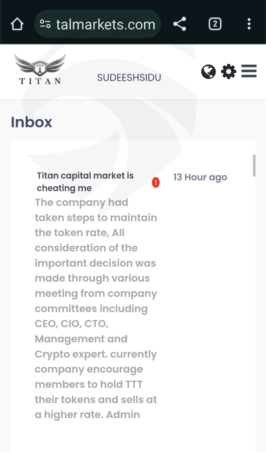 我在Titan capital market同音字8000USDT,但不能从分发账户和特权账户出金TTT,他们没给分发账户出金权限。而且他们将TTT的汇率设为零,合约结束后没有释放我的资金。我希望您能帮我向他们索取赔偿,将我的全部资金退还。我的账户名是Sudeeshsidu。