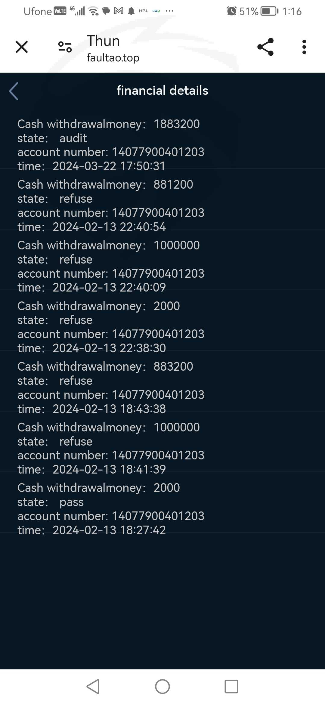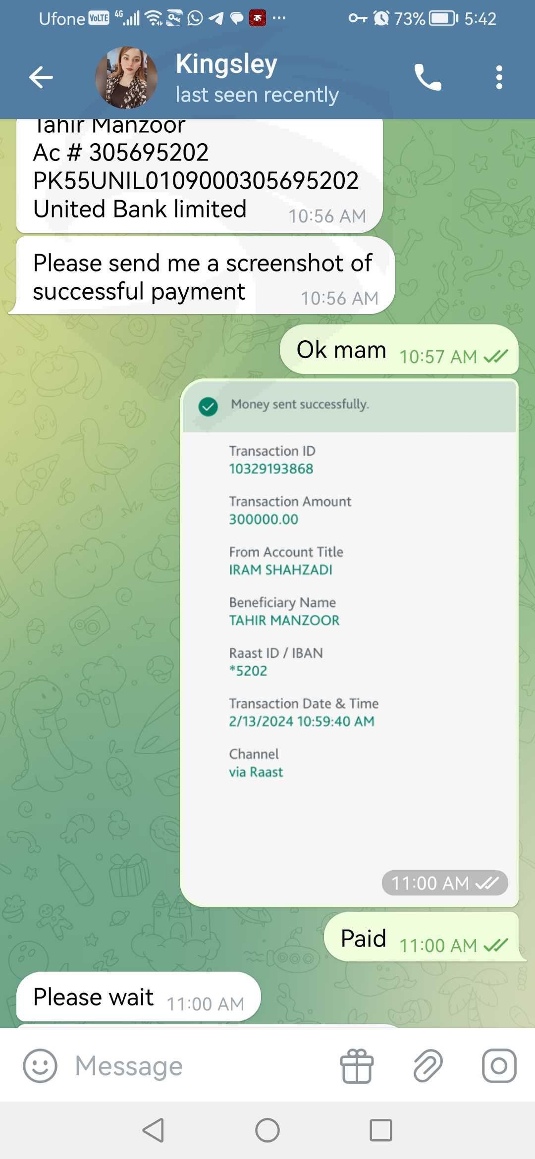 我是来自巴基斯坦的iram,我已经在 2020 年 2 月曝光了我遇到的问题。有人在 WhatsApp 上联系我:我来自vista公司,您可以在这里进行加密货币交易。我们发给您一些酒店,然后您去评论,每条评论您都会获得钱,您在家里就能赚钱了。然后他们向我发送了一家酒店的名字,我在谷歌上搜索,添加了评论,并在评论后将详细信息发回,他们给我发了钱之后,把我加到他的Telegram群里,之后让我做一些投资,我投资了 7,000。他给我发了 9000 佣金,与我分享了三个计划,18k 22k 和 50k 和 1lakh,我的投资是 18,000。在接受该计划后,他们将我加到一个有2个人的群里,如果你采取20 万的计划,你可以出金。在我投资了 20 万卢比后,他们分享了出金步骤,说我犯了一个错误,拿不回你的钱。如果你想要自己的钱,不得不再用30万卢比来弥补。剩余的款项和 30 万卢比的佣金将一同提出。当我给了 30 万卢比时,他们再次说你犯了两个错误,应该再支付 30 万卢比。之后会给你全额付款,即 10 万卢比加上佣金。当我再给 30 万卢比时,要求再给 60 万卢比,当我再给 60 万卢比时,他再次拒绝出金。几个月后,他们删除了我的账户,我投资了 140 万卢比,25000 卢比,但一无所获,请帮我拿回我的钱。以下是截图证明。