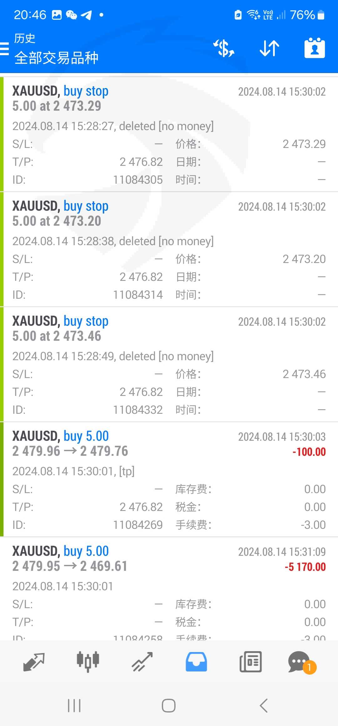 开了五张挂单,3张在2473,止盈在2476三张被取消2张2473被改2479直接被收割