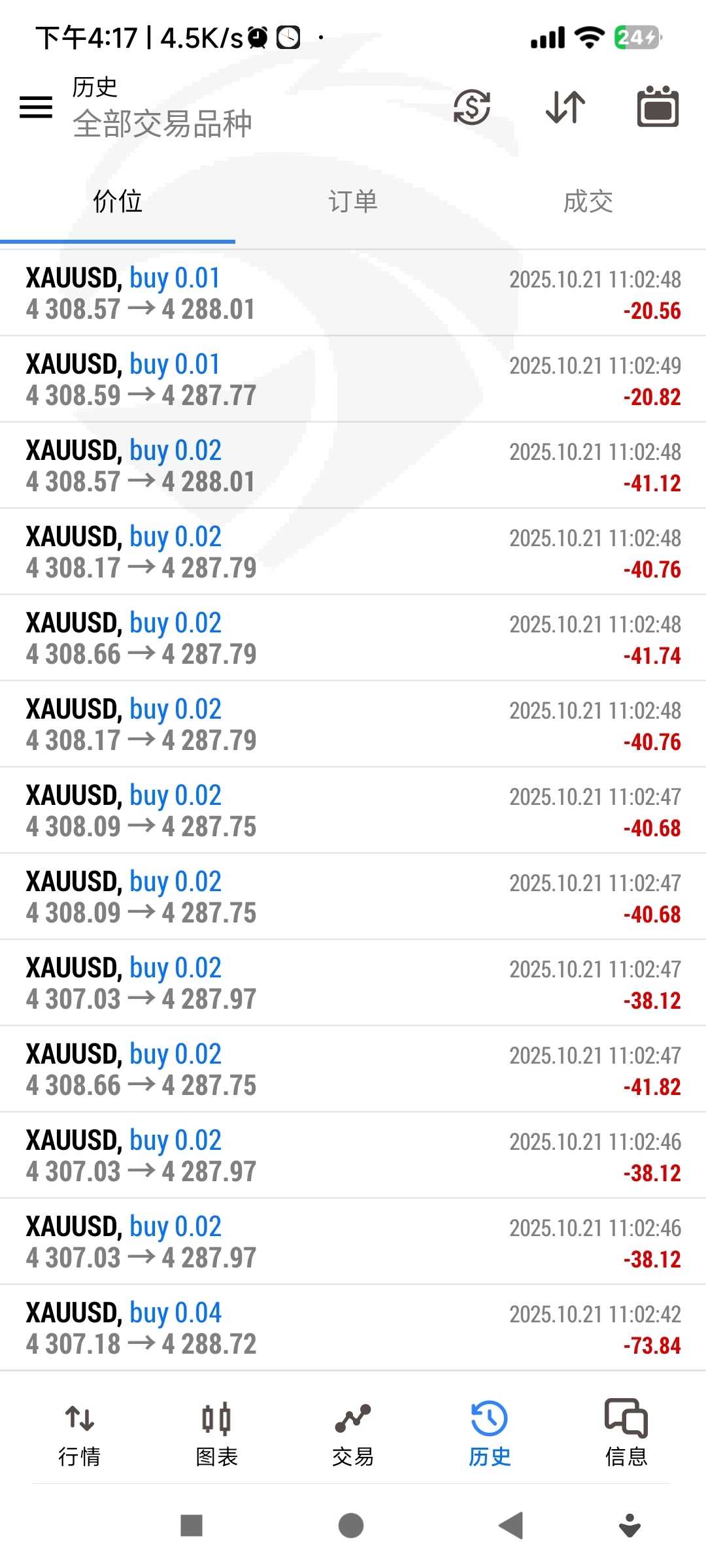连续下21单群通知EA失控,第五张图联系过客户经理确认过不会爆仓,2025.10.21.11.02.42开始爆仓,合作讲好是下单0.01手一单一结,今天不按规定手数下单,昨天是盈利一单下一单,亏损600多美金申请赔付回来 交易帐号300378可查交易记录