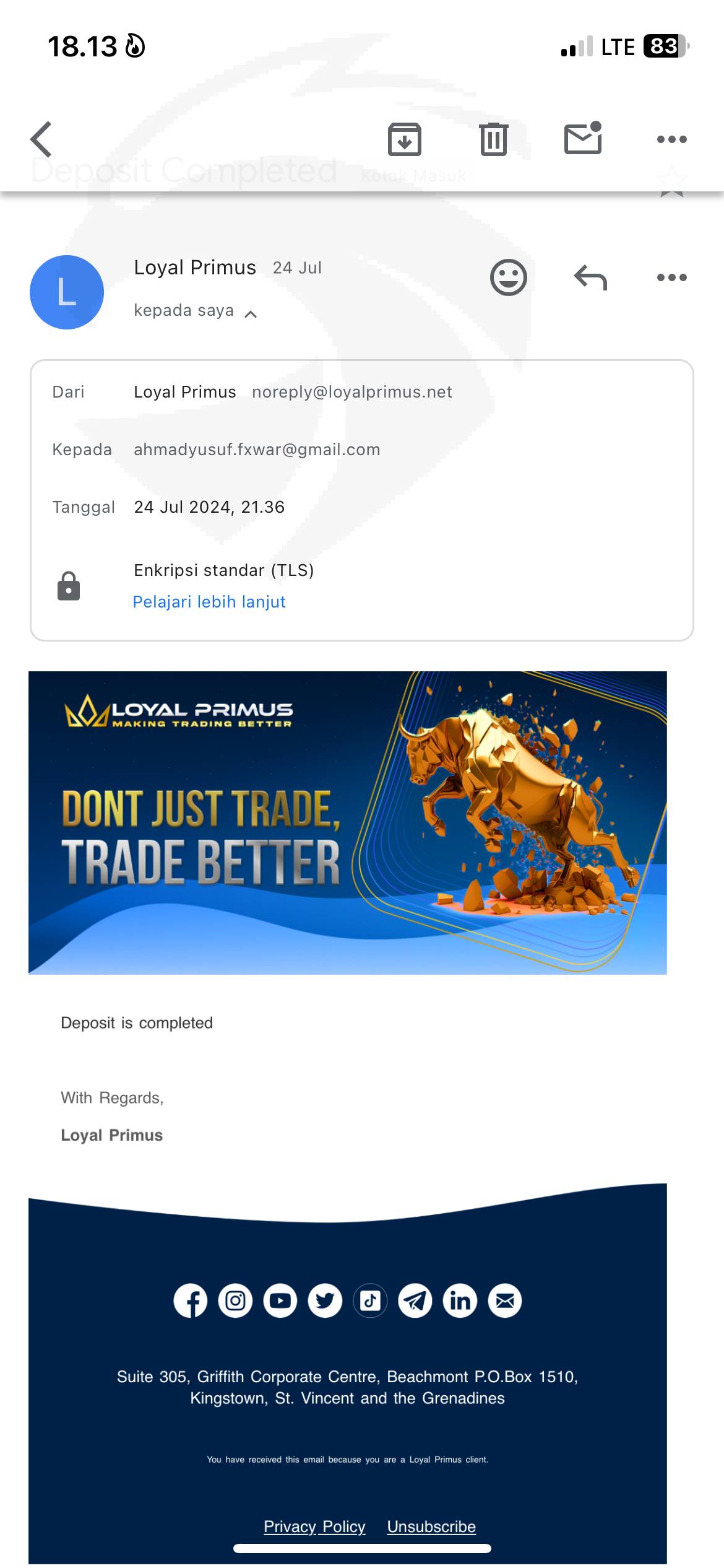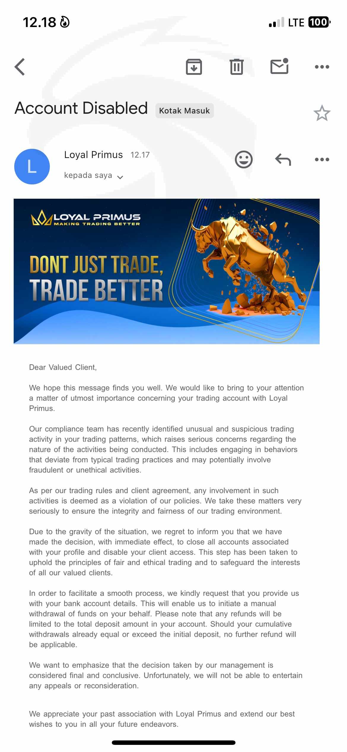 I traded at this broker with a deposit of 307$. Immediately after that I just traded normally. My trading was in the Xauusd pair with a layering lot of 0.03 with 10 layers. I sold in the 2420 area and I closed at around 2395, making a profit of around $875. Immediately the next day after making the payment details I withdrew all my money amounting to $1182.30 but immediately after that my account was disabled by LoyalPrimus. I hereby hope for the good faith of the LoyalPrimus broker to immediately pay all my withdrawals.