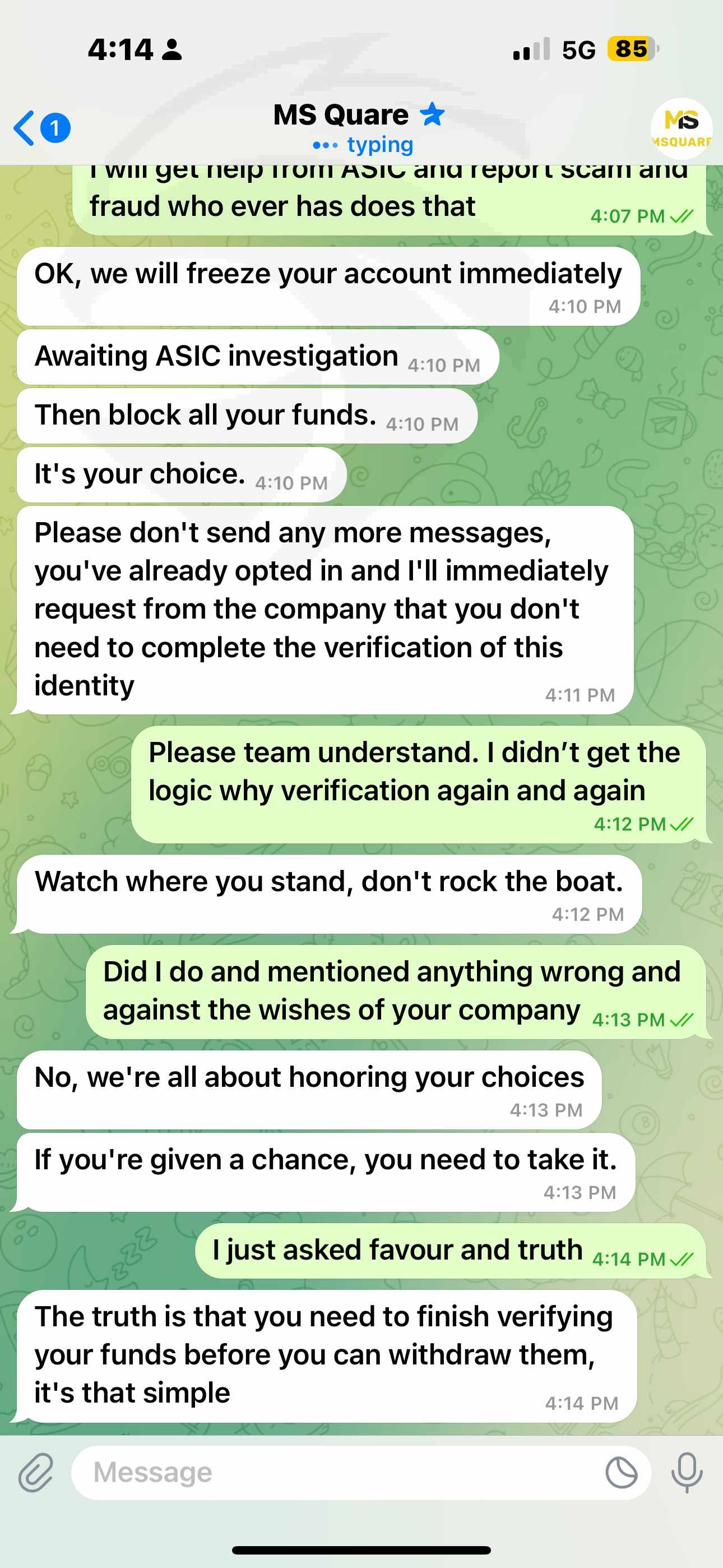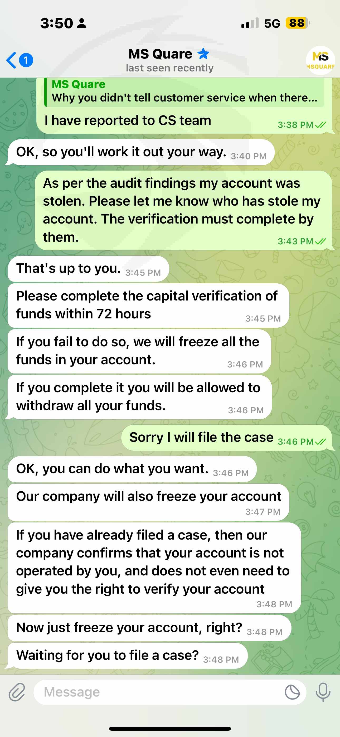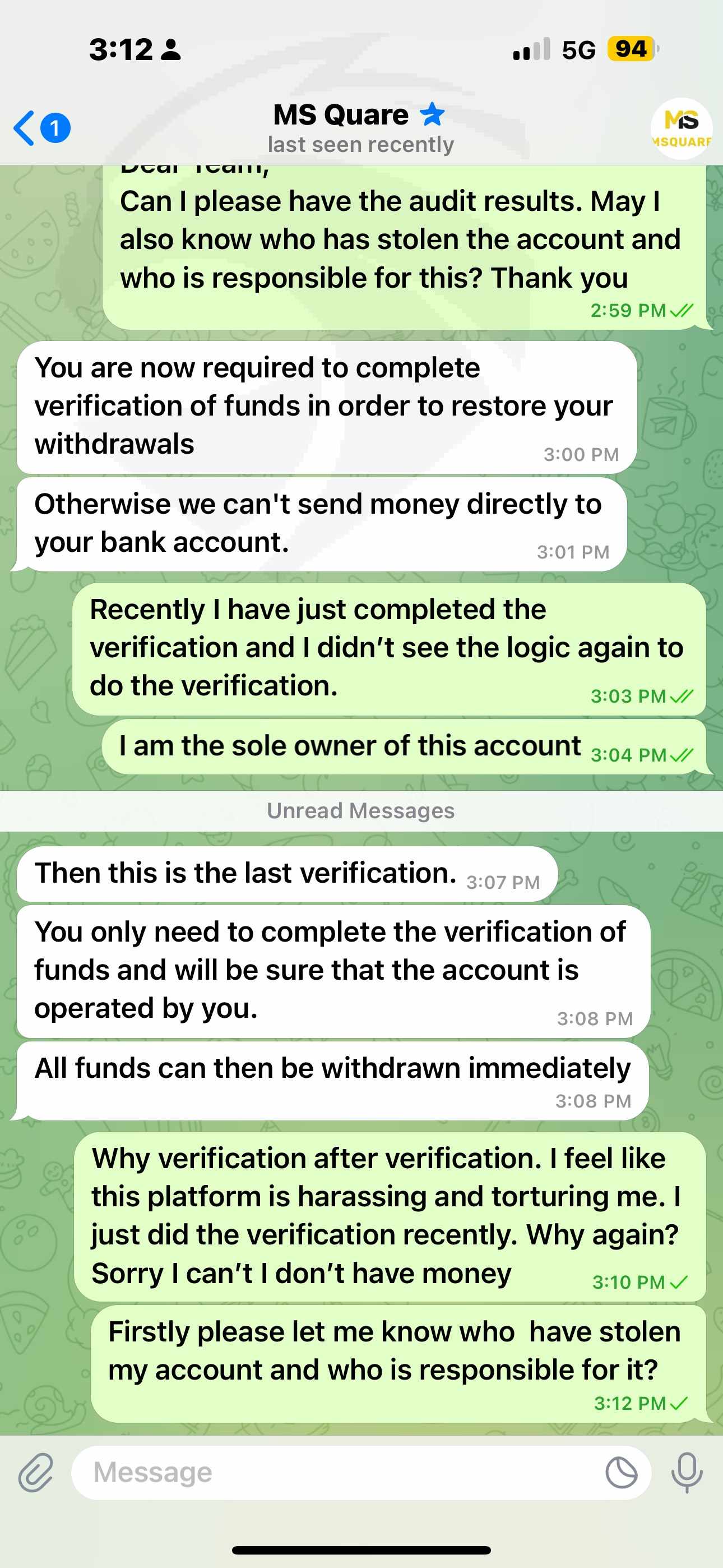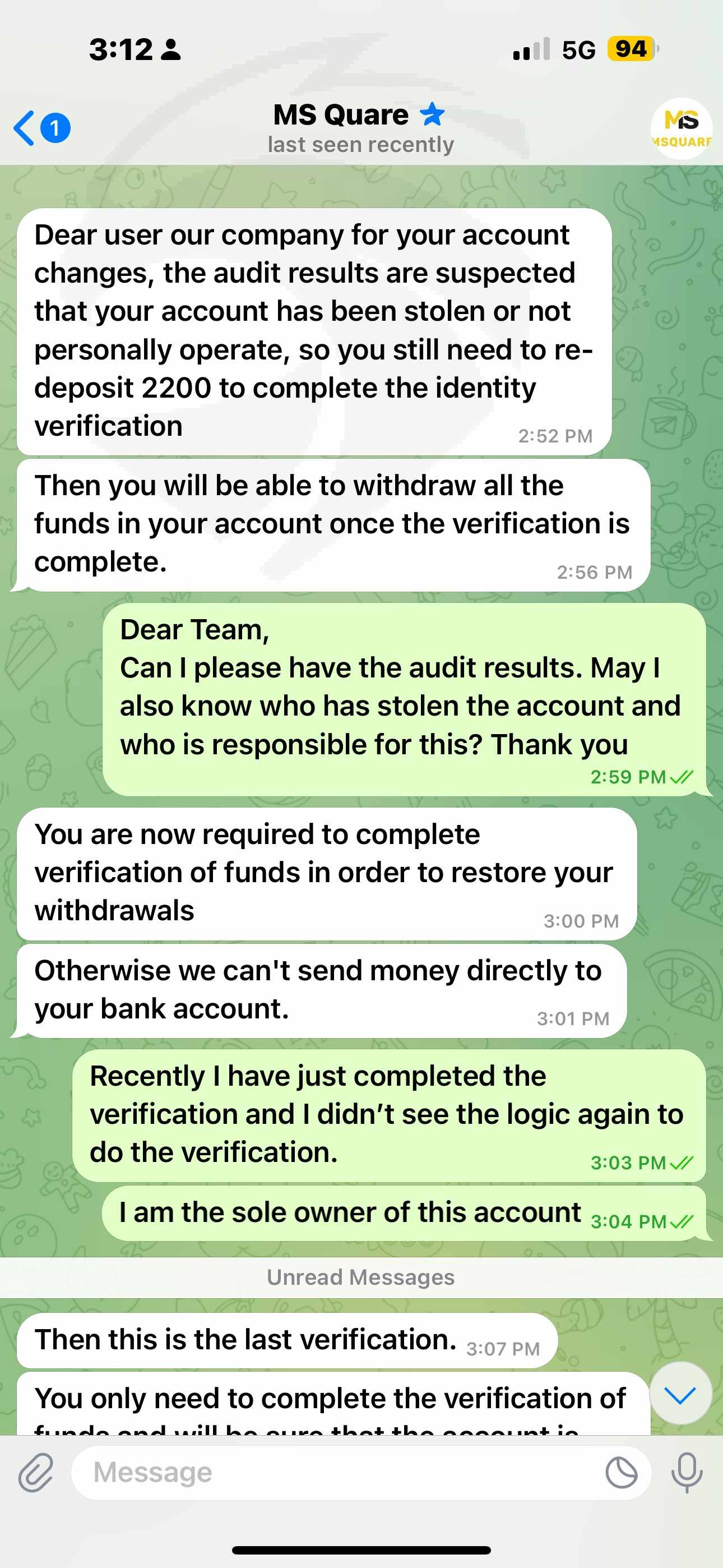 我加入了 MSquare最近我加入了该小组,我存款 4 次,到目前为止只提现了 100 美元。第三次存款后,我提现了 1000 美元,客服通知我提现正在审核中。后来我被要求存入总资金的 30% 以完成一次验证,因为我的账户被识别为机器人账户,之后我就可以正常提现了。我按照建议存款和验证。几天后,我再次发起 2000 美元的提现,同样的事情发生了。我再次被要求存入资金并完成验证才能正常提现。该小组表示,根据审计结果,我的账户被盗了,操作不当。我要求在线客服团队向我发送审计报告,谁偷了我的账户,但他们没有发给我。我甚至给公司管理层发了邮件,要求他们解决问题,但从来没有发生过。我不明白为什么我需要一次又一次地验证和存入资金