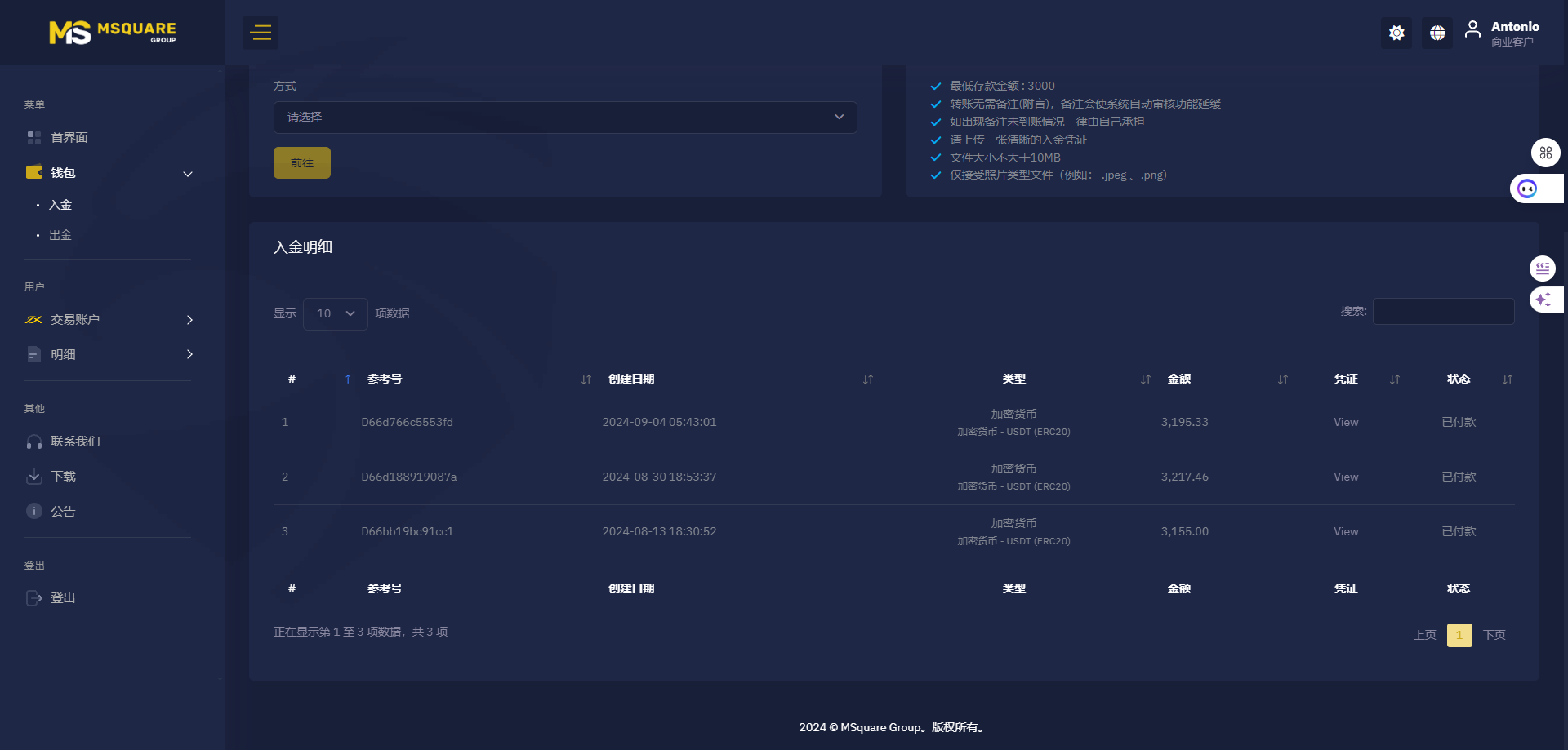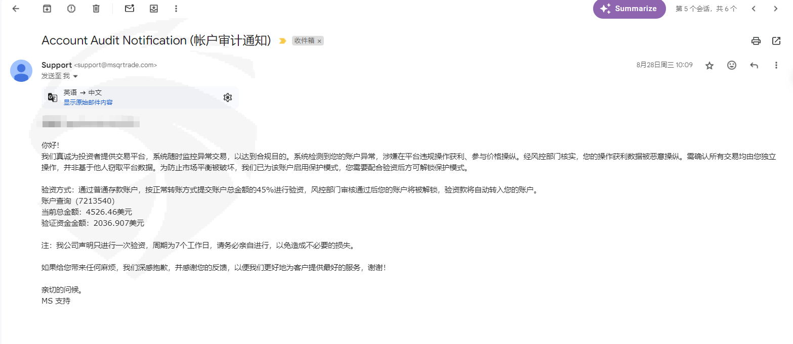 进入这平台入金3100usdt ,交易了2单盈利1500usdt 平台发邮件说恶意操纵账户冻结需要验资入金45% 需要入金2036 usdt 。我入了金验资完成需要出金填写出金地址账户又被冻结说我涉嫌洗钱又要验资40% 入金金额3097usdt 。再一次入金验资,验资通过我就出金账户金额 10939usdt 平台发邮件我需要交税28% 还要我继续入金金额3062usdt 要不然不能出金。这时候我发现自己被骗了平台根本就没想过让我出金
