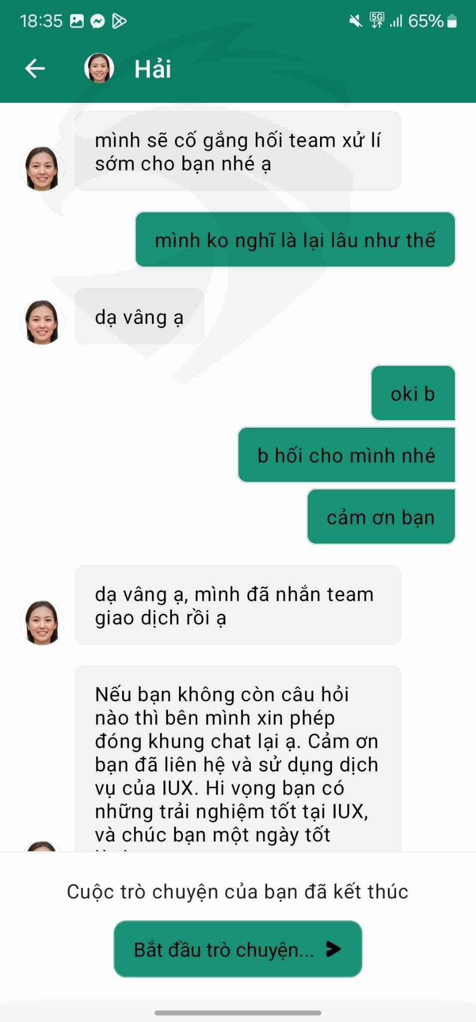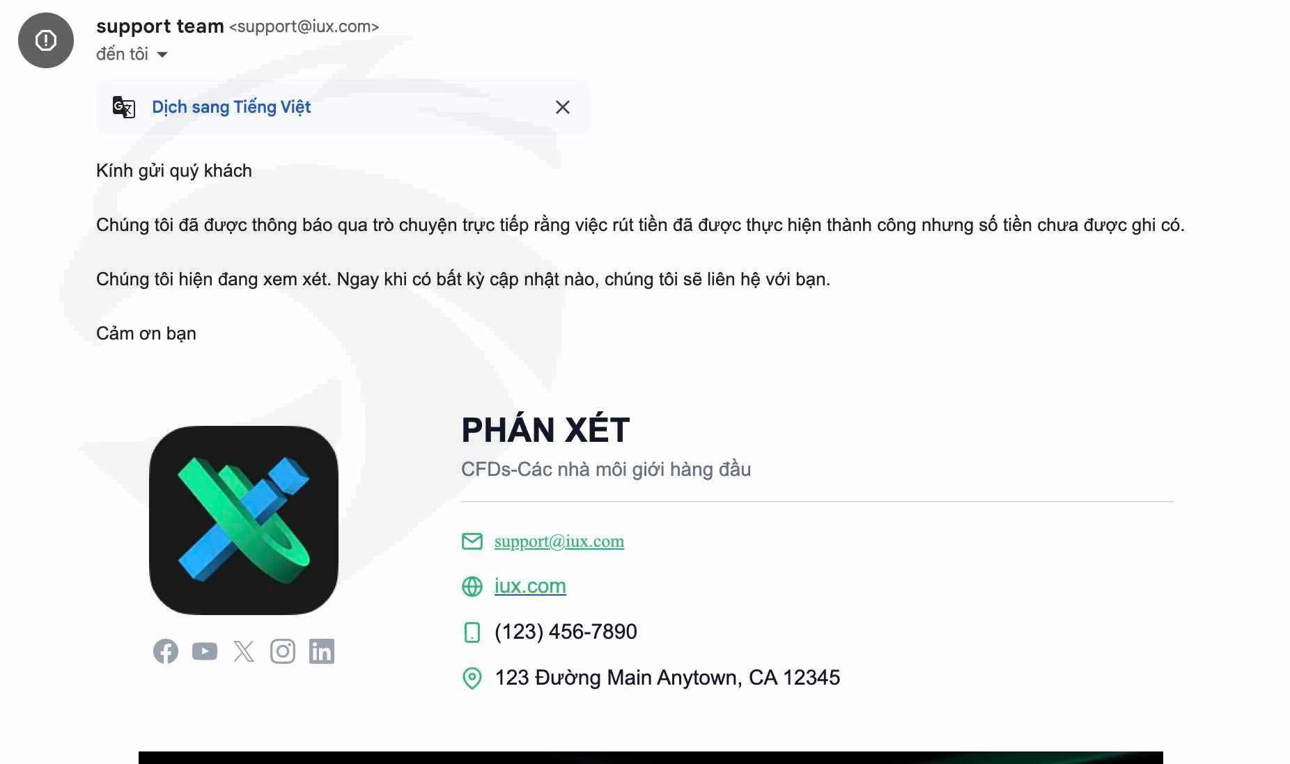 Hiện tại tôi đang giao dịch tại IUX. Nhưng khi tôi yêu cầu rút tiền về tài khoản ngân hàng thì IUX báo xử lý trong 24h nhưng đã qua 24h mà tiền vẫn chưa được chuyền về ngân hàng của tôi. Trong bảng thông báo tin nhắn thì thấy báo đang được xem xét.