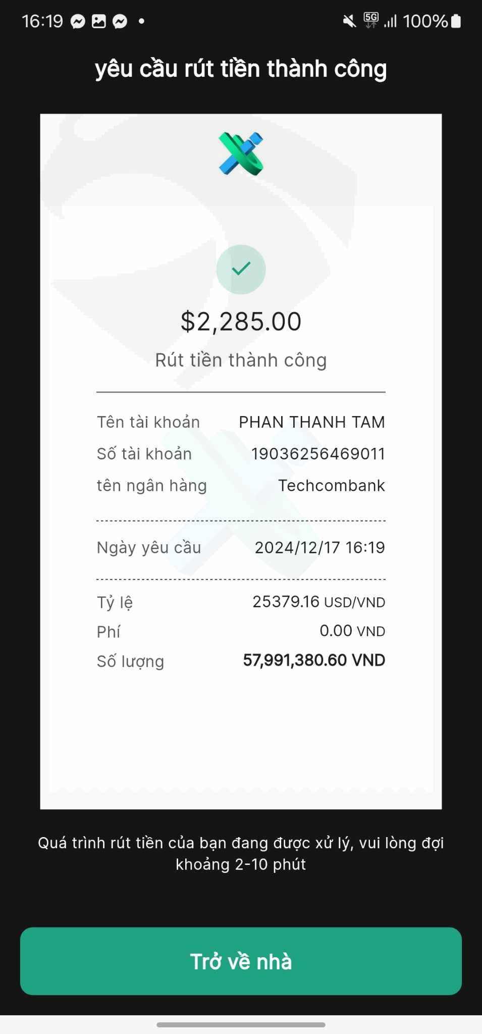 Thời gian rút tiền 17/12/2024 16h19 và đến hôm nay 19/12/2024 vẫn trong trạng thái xem xét.