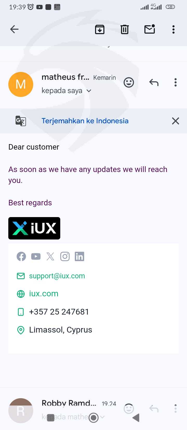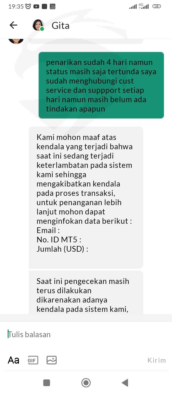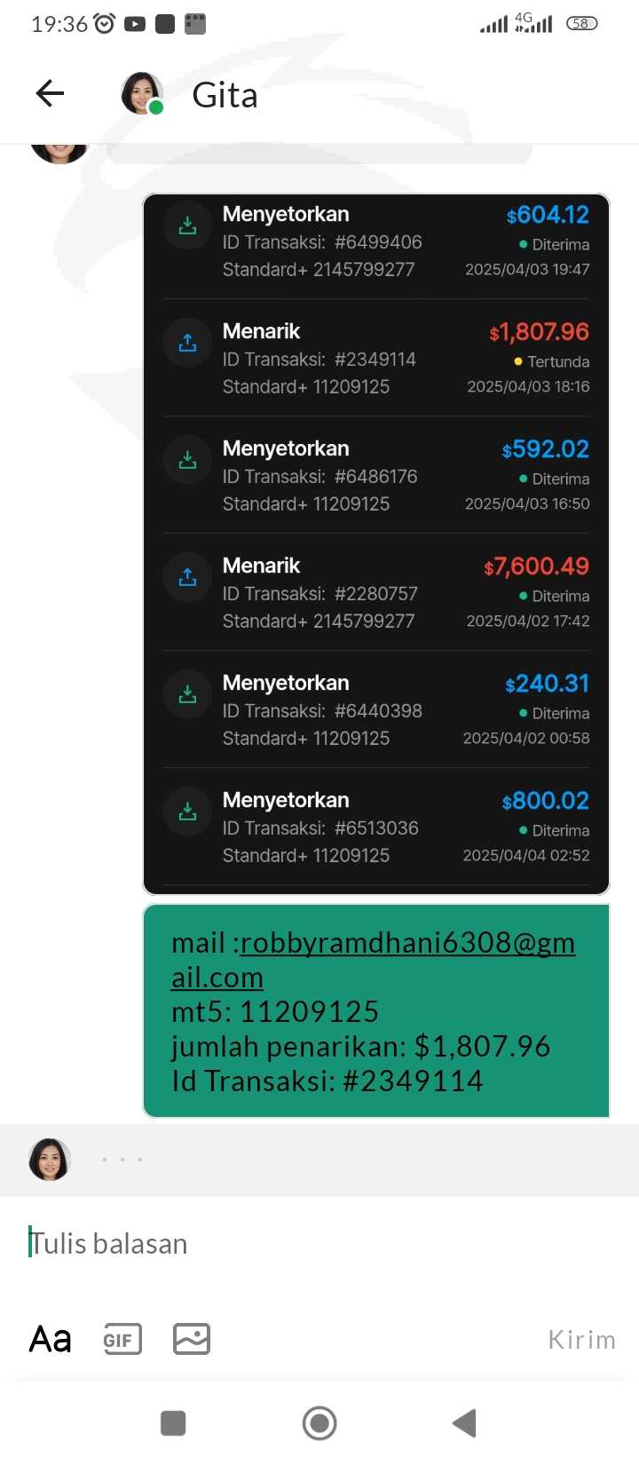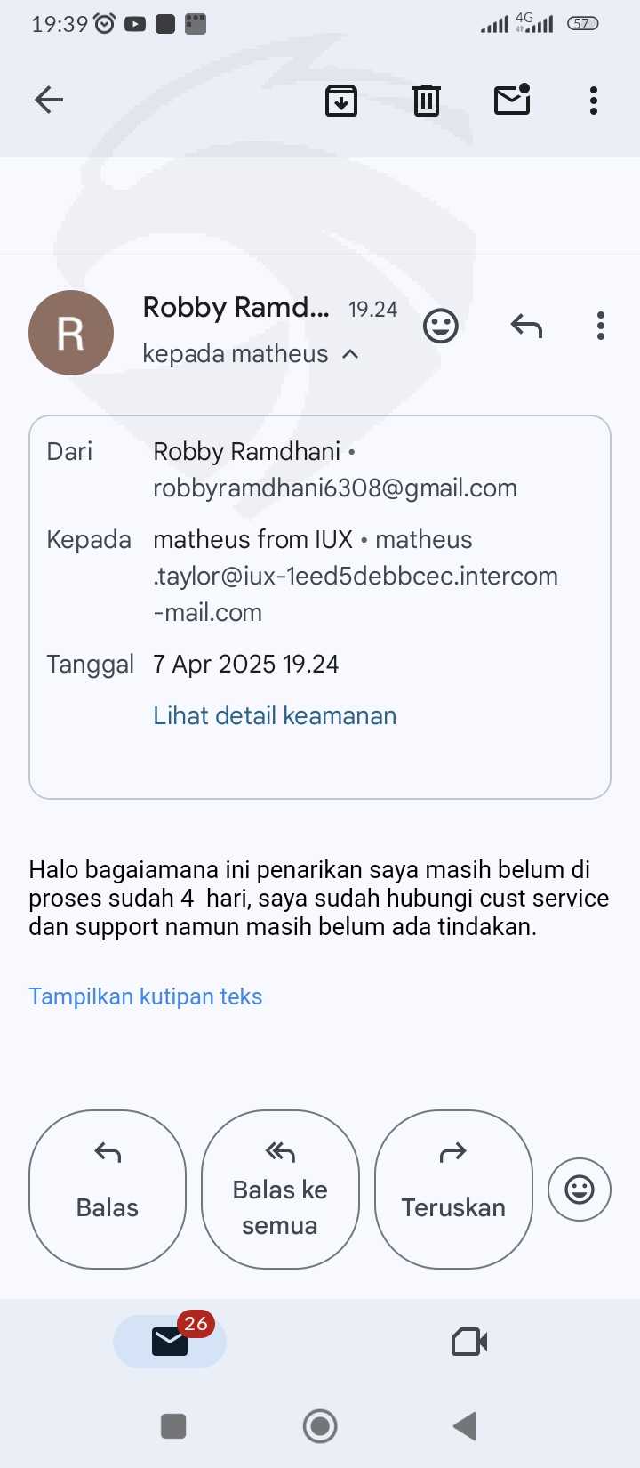 我在经纪商处提款 IUX但已过去4天,状态仍为待处理。我每天都联系在线聊天和支持人员。但他们说的总是一样,叫等24小时,但到现在已经4天多了,提款状态仍然没有改变,仍然是待处理状态,?!!这是邮件详情,mt5账户,提款金额,以及提款交易,邮箱:robbyramdhani6308@gmail.com mt5账户:11209125 提款金额:$1,807.96 交易id:#2349114 请立即处理!!