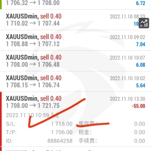2022.11.10.10:59做1708空单0.4手没有及时止损在1715 系统出问题滑到1721才止损 止盈1706 之前下单一直没有这样的情况出现