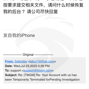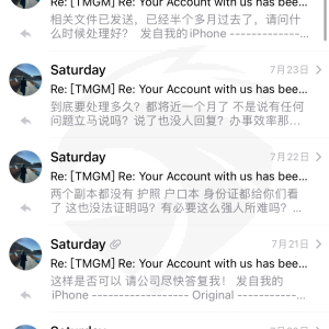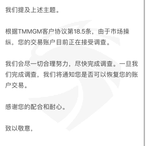 2025年6月9号,我在TMGM平台入金3000美金,使用跟单交易,随后的6月27号我的后台账户全部被暂时封停,至今没恢复!!之前也问过,平台是允许EA交易等其他跟单策略交易的,被封的很莫名其妙 好 那竟然封停了,那就解决问题 一开始跟平台发了无数的邮件,没人回应,客服也说是风控部的事情,无限甩锅,等了半个月终于有了封邮件,说要上传政府认证资料 好 资料上传 (上传了身份证 户口本 护照 )然后又是等,乌龟一样的效率 一等又是一周半个月。说要政府认证的公证副本,这些资料还无法证明吗?做公证副本的费用和时间精力你们平台来赔付吗?说有疑问立即联系你们 联系了也没人,这么大券商 实在搞不懂整这出 这样除了流失客户 给自己整黑料还有什么好处!!大家谨慎入金!!