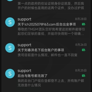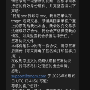 本人于在tmgm开户交易多年,2025年7月前后后入金超20wUSD,后续为了资金周转申请出金,但是平台卡着不让出金,随后在8月19日,发来邮件说本人进行了违规交易,未具体说明哪一个账号或者哪一个单号违规,并要求签署霸王条款,只出本金,且没有明确本金多少,只写了当天申请的一笔四千多的出金,严重不合理且强盗!!!