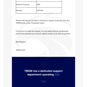 我帳戶裡有4010美金 在12月17日申請出金 不斷詢問客服他們始終回應處理中 直到1月2日 我的帳戶被全面凍結 用戶中心也無法登入 4010美金中有1200美元是我的本金 TMGM根本是蓄意詐騙拒絕出金