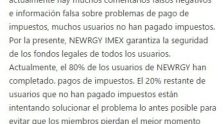 我被这个可疑和欺诈的“经纪人”诱导参与了金额为 1400 美元的投资。然而,尽管一些用户声称他们已经成功撤回,但就个人而言,该平台从未允许我这样做,而且时间也不允许。提现进展缓慢,承诺2024年8月16日即可提现,但借口已在纽约证券交易所上市,据说美国ISR机构顺便要求所有用户缴纳相关税款。平台要求我们缴纳ISR所谓的税款,并以冻结资产为威胁,并在今年8月26日前窃取资产进行逃税,紧接着,这些卑鄙可恶的骗子就消灭了我们的“利润”。站点网站,因此可以访问应用程序帐户 NEWRGY IMEX,我一定会全面投诉,小心这些小偷。