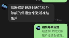 要出金就被锁帐号,还另外请他们的专员跟我说要缴资金的50%才能解锁,汇款解锁後没几天,就把帐号里的钱用"投资失败"的方式把钱全扣光了
