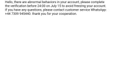 我不再感兴趣了。我通过贷款进行了正常交易,我在交易中使用的是我自己的钱,你凭什么冻结我的帐户,你要向政府当局给个合适的理由,说明为什么冻结了我的帐户。所以,如果你要么解决问题,否则我将进行投诉 USDC Investment 有限公司。那么你就别无选择了。所以我要求你让我提取我的资金,你之前以税务核实的名义拿了我账户余额 20% 的钱,然后你冻结了我的提款,然后你又要10%的金额。这是异常行为。我已经从银行贷款了,我有所有证据,正在等待回复