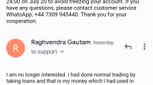 你好,我在 USDT Invest Ltd 上正常交易。当我申请提取利润时,平台要求我存入 20% 的税,我取了银行贷款并存入,现在又要存入 10% 。 请您查看一下并帮助我出金。 我有贷款、电子邮件和whats app聊天的所有证据。在此之前我已经出金两次50美元,都成功了。 附上客户服务部向我提供的公司注册号码,供您参考。