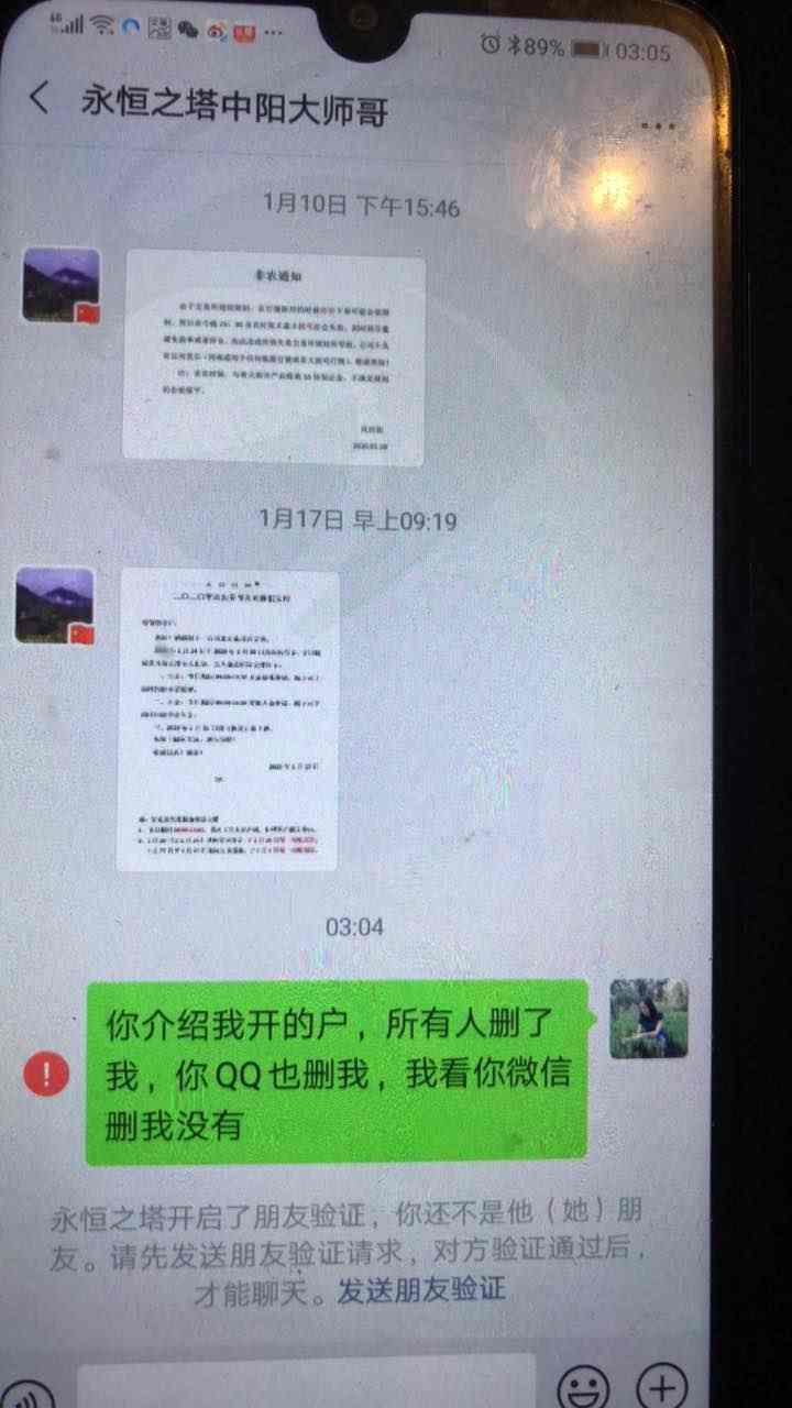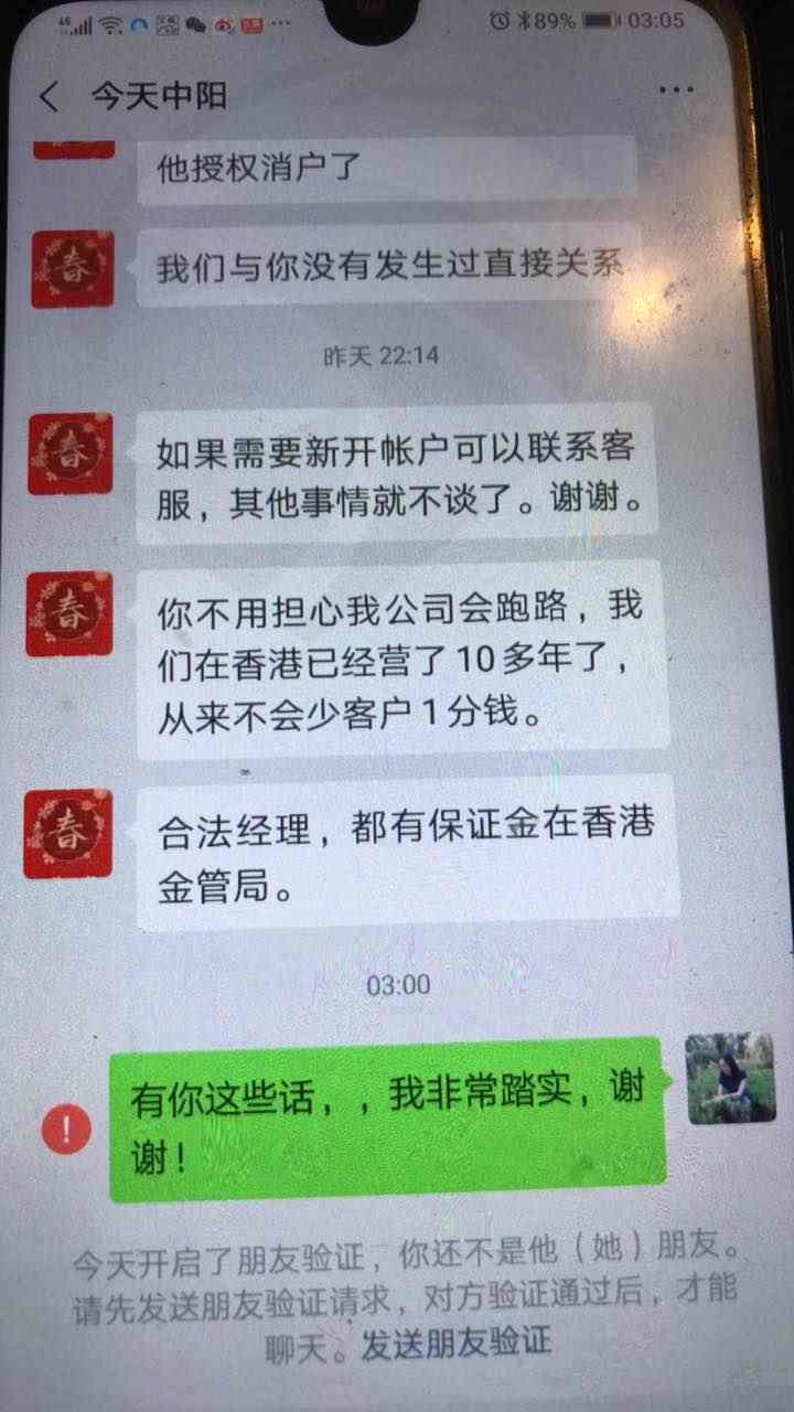介绍我开户的删了我,然后一直冒充他们在香港,是中阳控股总公司的技术人员也删了我,软件时常登不上,开不了仓,用的是春之舞软件,骗子骗钱,让我凌晨三点还睡不着,每次我爆仓在最高最低,让打交割单,一直没打