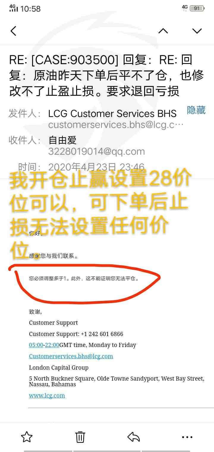 我在lcg平台20日晚上22点钟开户成功入金14121元,23点钟开第一个单子原油10.8多单,下单后我马上设置了一个止盈28价位,后来我想再设置一个止损在10价位,可手机一直设置不了止损,也平不了仓,万般无奈下我录了当时一个视频无法操作设置止损和平仓。同是在的单子没有爆仓前发微信给LCG客服经理多次,说原油单子无法操作止损和无法操作平仓,没有回复微信。