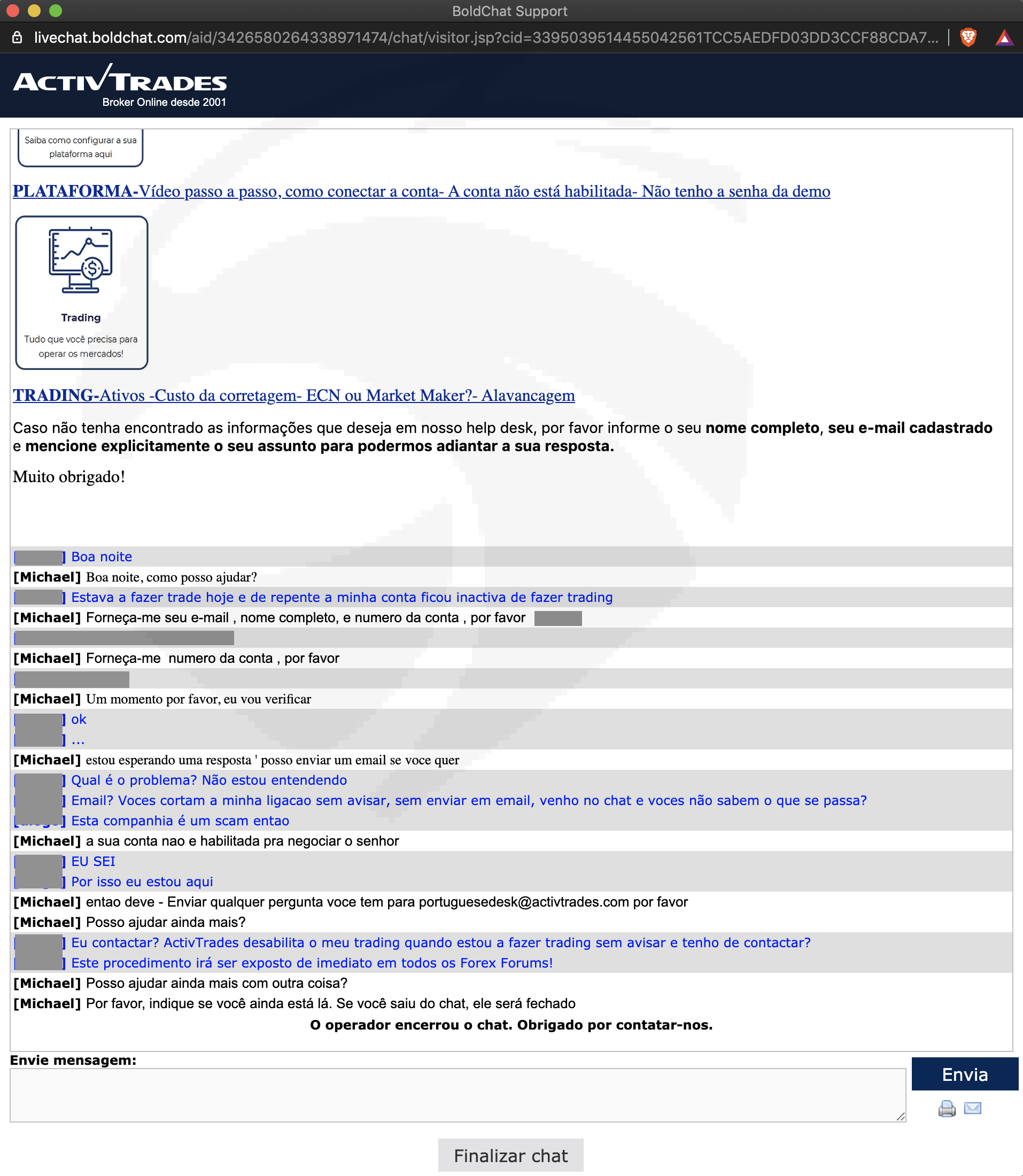 我在平台上交易了2天,从一瞬间起,他们意外地断开了我的交易帐户并使其失效。在我与在线聊天联系并询问为什么我的账户在交易时无法交易之后,我一直等了5分钟以上,但他没有回复,五分钟后他才通过电子邮件回复了联系,但在断开连接后,却没有让我知道出了什么问题。