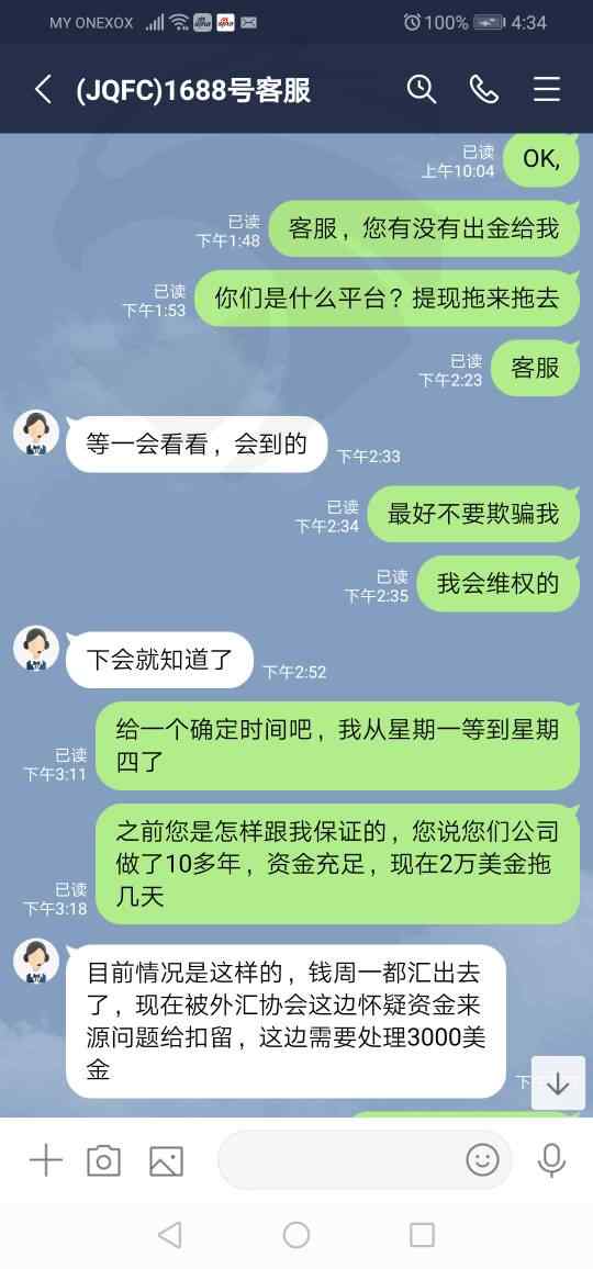 欺骗说已经出金要1-3工作日会收到,3天后又说等到下午,最后说已经汇款了,被外汇协议怀疑扣留,要交3000美金才能解决问题