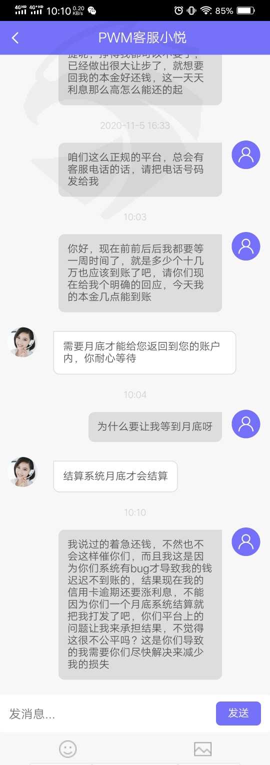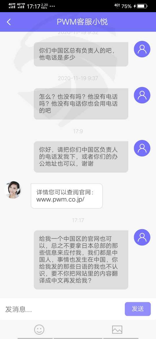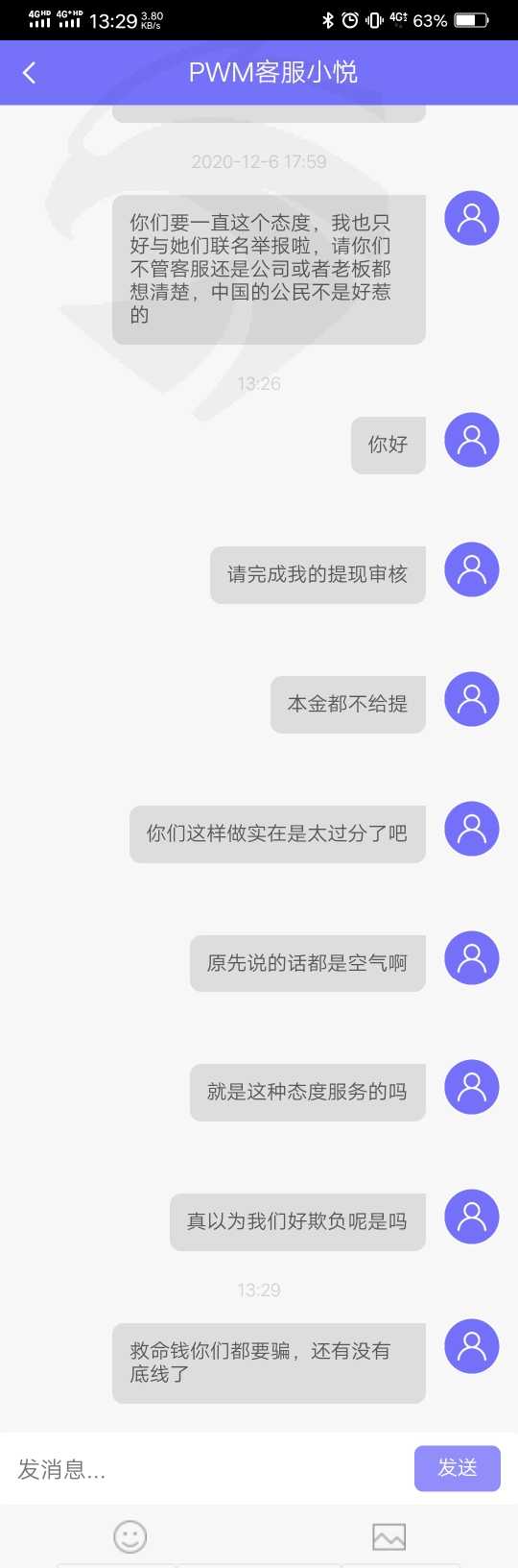 在2020.10.30日联系客服入金,10.31正式在PWM平台进行操作,最后在交易完要提现时客服以我银行卡号错误为由让我交保证金还有身份证和银行卡照片,客服说可以帮我改正银行卡号信息,交了保证金后还是提现不成功,客服又告诉我信用分下降等理由阻止我提现,但我是在交了保证金后并且信用分百分时申请提现的,平台没理由也没道理不给我提现到账的,于是我要求客服给处理我的出金问题,但最后客服告诉我要等11月末平台结算时才可以,直到11月19日客服还在说让我等月末,但是当我11月22日再与客服联系时,直到今天12月8日,客服也都没有任何回复,我的本金17万多就这样销声匿迹,被他们骗走了,本以为可以改善家里的生活质量,结果现在还要还信用卡还贷款是雪上加霜,请看到我消息的友人们帮忙转发,不要让其她人再受其害,同时也请相关部门能够帮忙严查PWM JAPAN PWM日本证券这个平台,可以帮我们讨回公道,让他们还我们血汗钱,让中国的国民再免受这些平台的欺害!