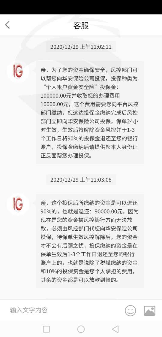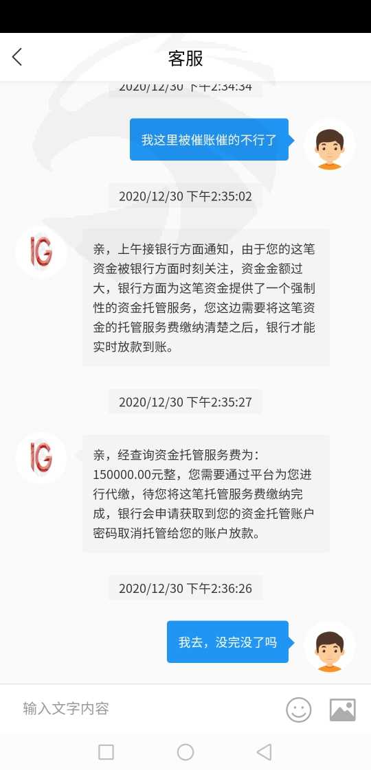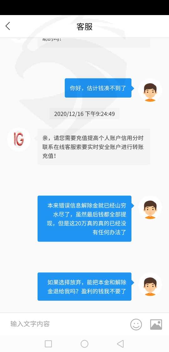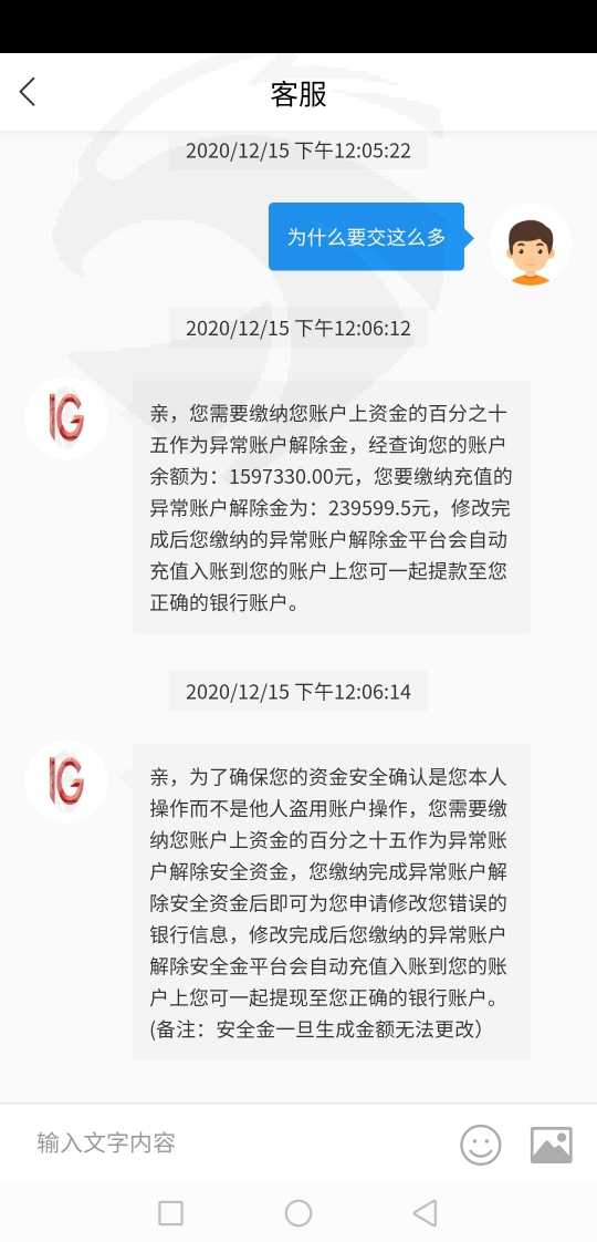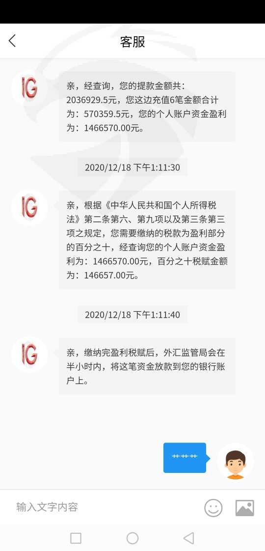 就是看在属于被监管的平台,作为老百姓就相信了IG平台,从投入本金130760元到操作完,以银行卡信息错误开始,不停的让交钱。一开始真以为是自己输错了,所以作为忠实客户,选择无条件相信,就一而再而三的交钱,最后客服告诉我没有任何问题了,但还是等15天审核。我很想知道如果你平台真的不是骗人的,互联网时代,需要审核什么需要15天,说白了就是骗人的,不出金。