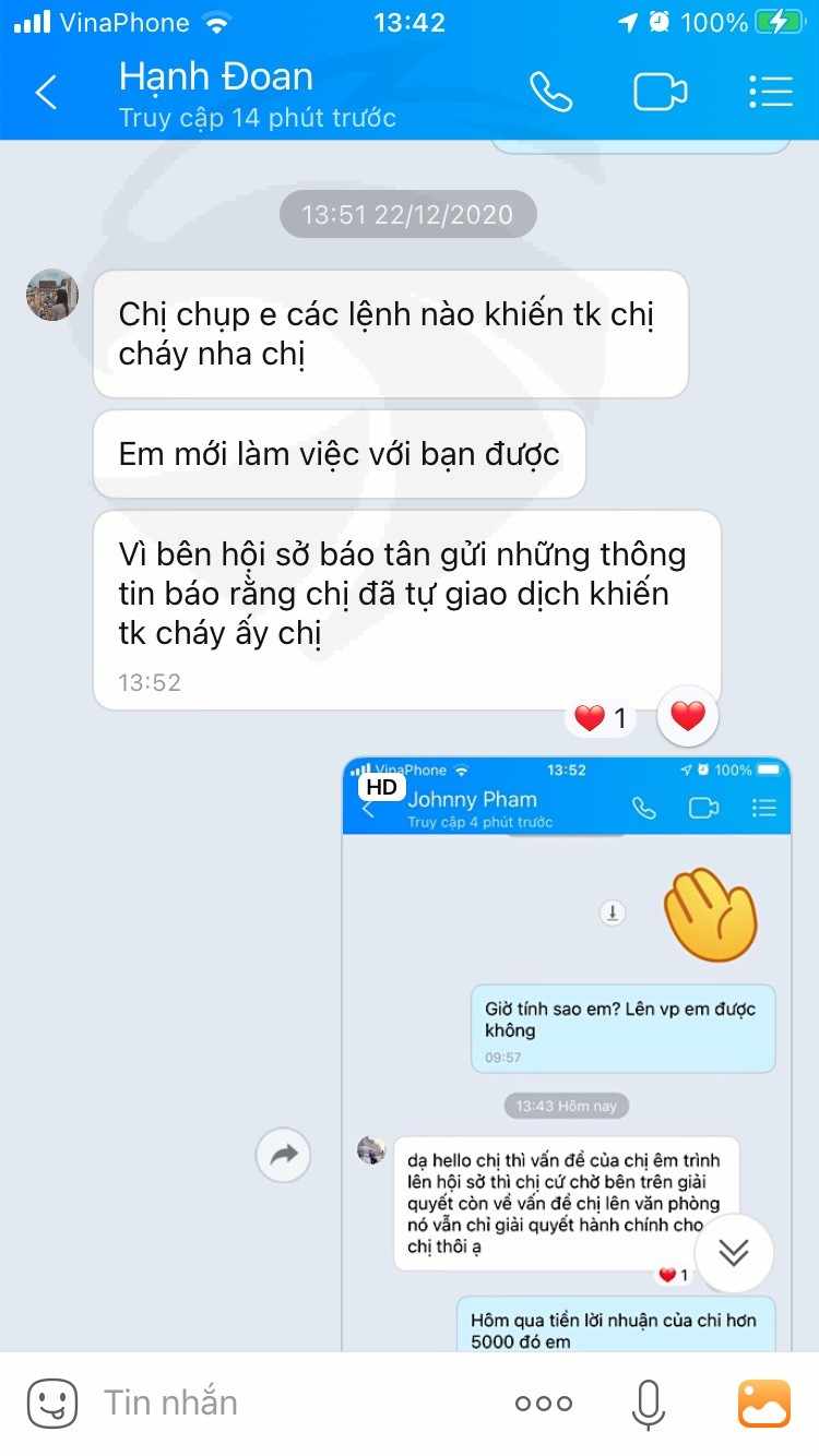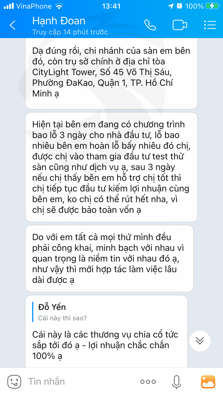 Tôi bị Hạnh Doan ( 0907912398 ) Va Tan ( 0903725241 ) lừa đảo với tk đóng 150 triệu, giao dich theo cổ phiếu của chuyên gia và mất hết 17, 000 đô , họ khuyến khích tôi đáng Nas100 để cò tiênn nuôi cổ phiếu, giờ sàn LCM kg đền vì nói là lỗi của chuyên gia, đi đòi chuyên gia, giờ tôi cần hổ trợ của ai đó biết 2 tên lừa đảo này làm tk tôi bí cháy, họ khẳng đnh là nếu sàn kg đền họ sẽ đền tôi.
