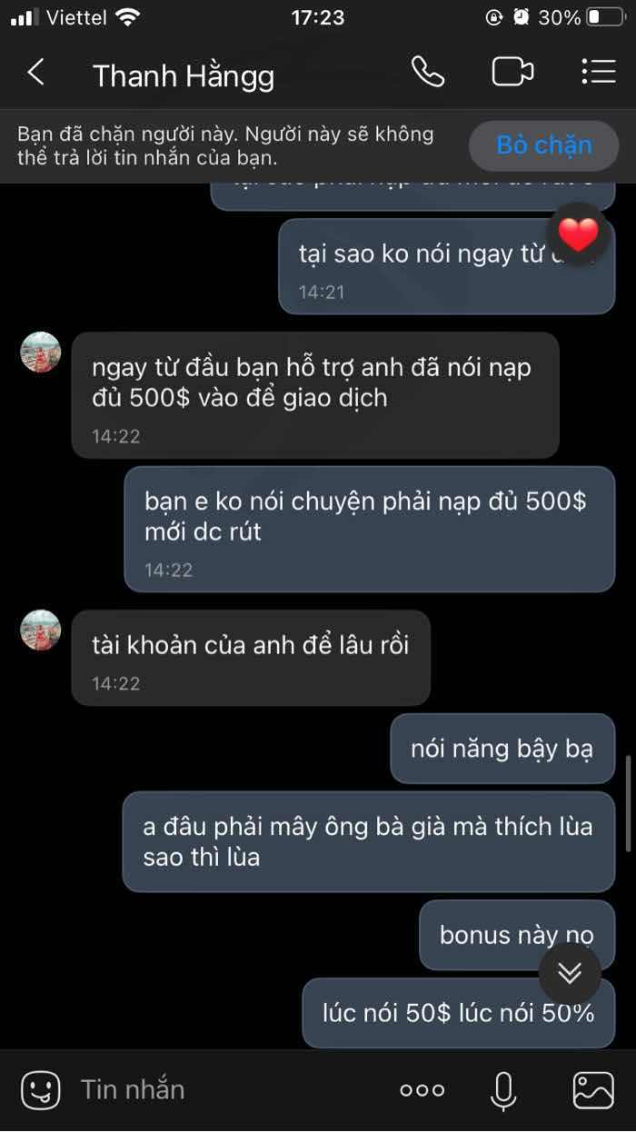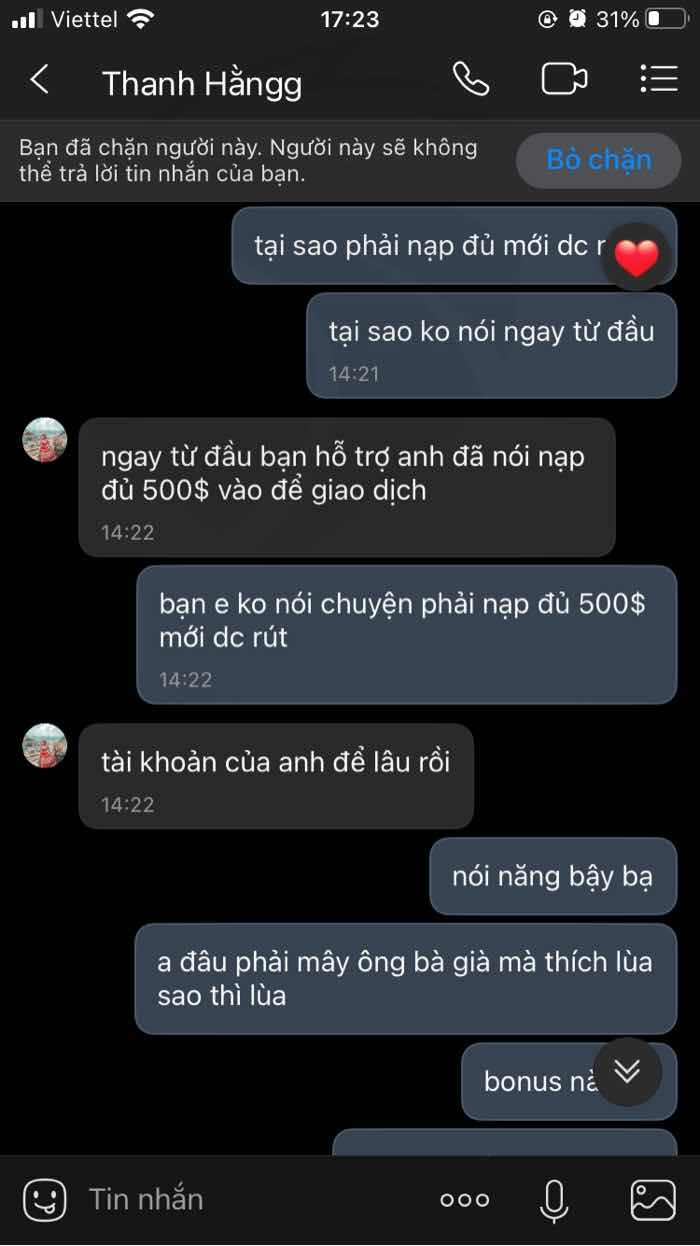 Sau khi nạp 340$ vào tài khoản. Tôi đã tự giao dịch và kiếm được một ít lợi nhuận. Nhưng khi tôi yêu cầu được rút tiền thì họ bảo rằng tổng tiền tôi phải nạp là 500$ mới có thể hỗ trợ tôi rút tiền. Trong khi trước đó họ không đề cập đến việc phải nạp đủ 500$ mới có thể rút tiền. Sàn GICC FX là một sàn giao dịch đáng ngờ.