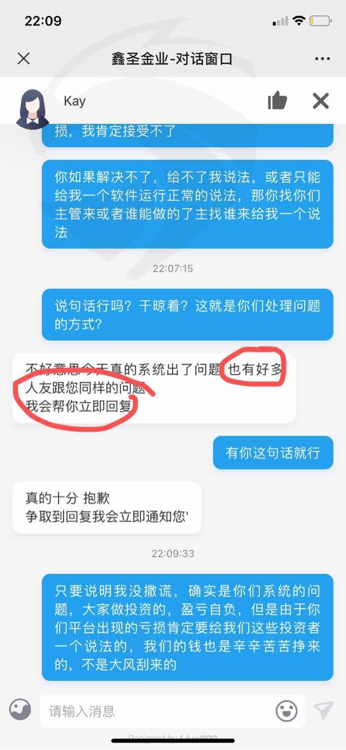 只要一有大行情软件就会很卡,无法平仓,5月1974日晚上9点至9点半,由于软件卡死,直接导致爆仓。爆仓后找客服说软件卡死问题,客服明确表态当天系统确实有问题,有很多人跟我出现同样的问题,并表示会给我一个回复,结果第二天客户经理直接推的一干二净说客服以为我说的是早上无法登陆的事情。也就是可以理解为,软件卡顿、卡死=无法登陆?等技术部门调查了一天,说当晚mt4运作正常,但是我询问mt4运作正常是否能保证鑫圣软件一定正常运作,客户经理一直逃避问题,不做正面回复或直接几个小时不回复拖时间。
