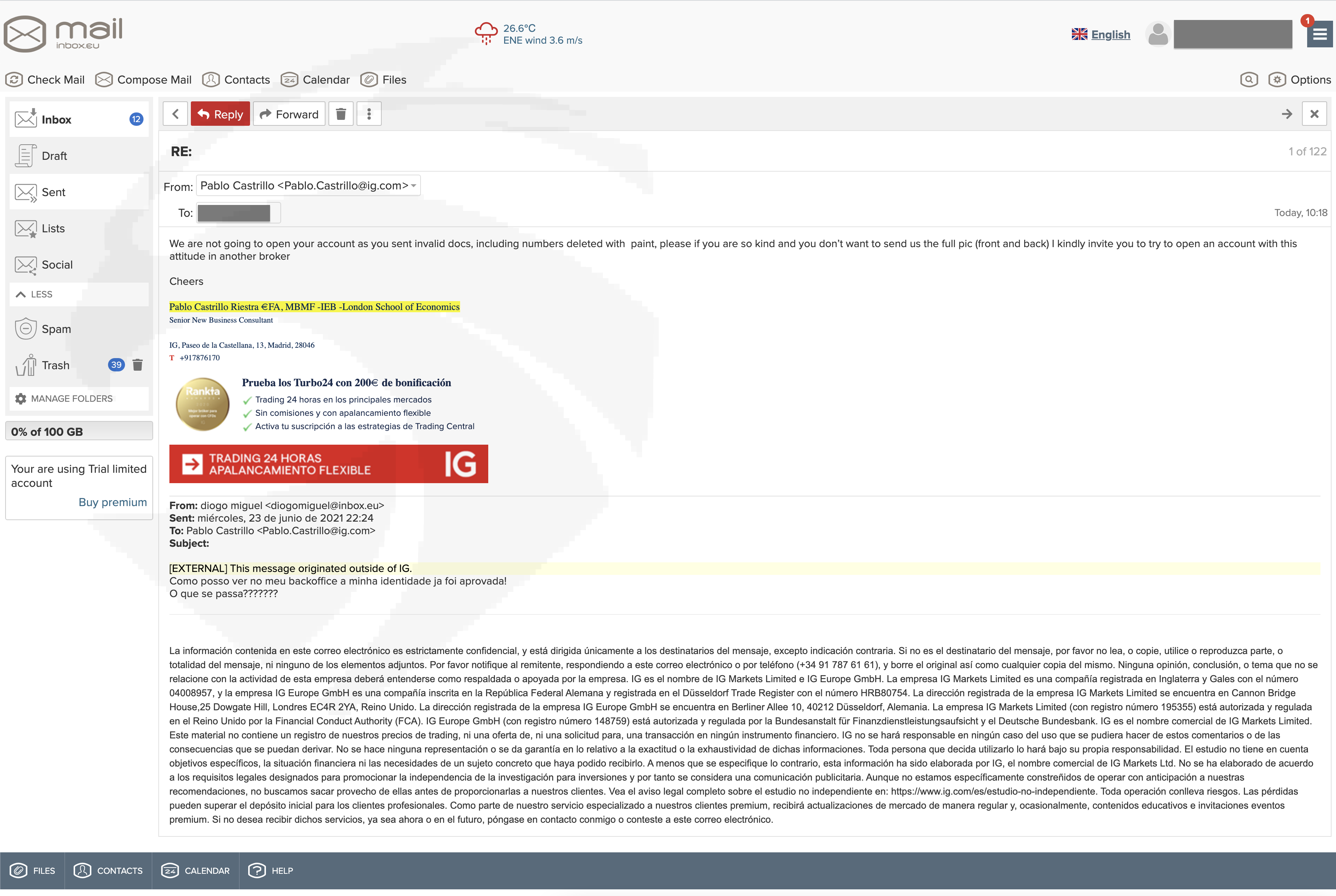 After opening an account there and submit all the necessary and required documents i received an email saying to be approved i must call IG. After many attempts, i was able to speak with a Spanish representative, and she mentions in order to be approved i need to contact the gentleman Pablo Castrillo. After another session of calls, i finally spoke with him and he mentions i need to send more documents in order to be approved. I confront him replying i have sent all the documents required by your website, to which he replied "my analyst needs more documents". I ask him for information about his analyst, he refused to disclose it. I sent several emails to support i never got an answer!! Finally, i got a rude answer from Pablo which i post here. Finally saying, IG has many factors to be a scam!