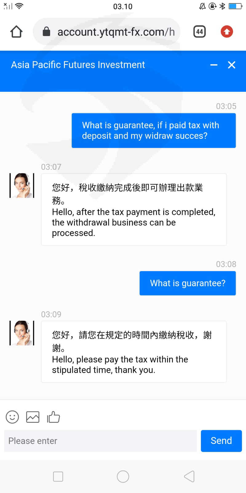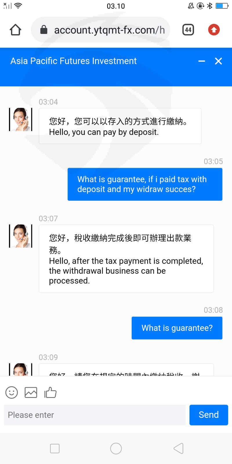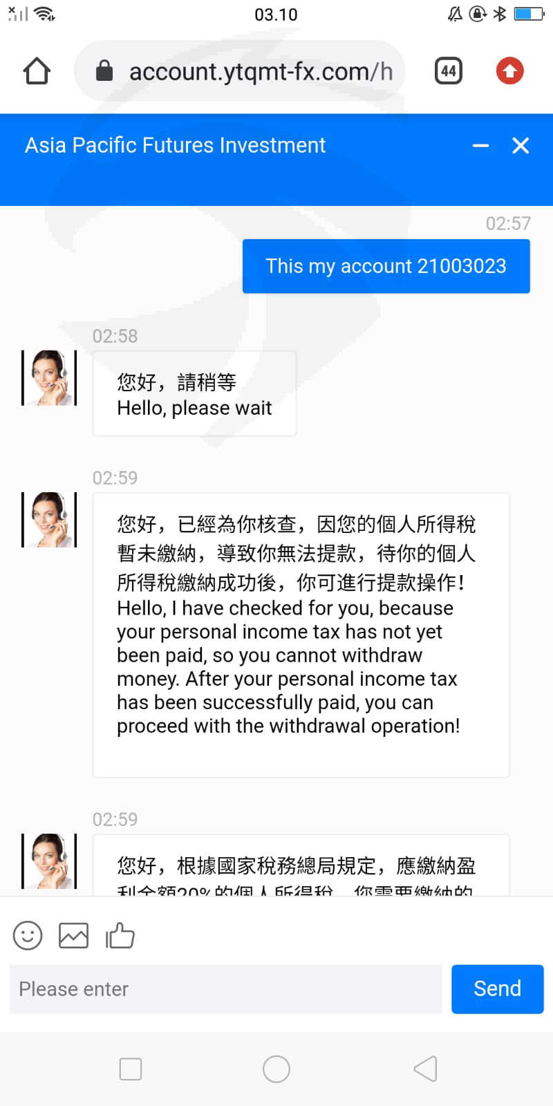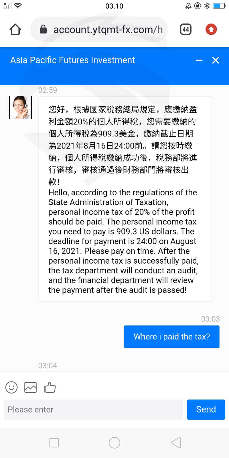 我根本不能提现,理由是我要交税,但交的税必须存到平台上。他们无法解释税收是什么,所以这是一个骗局。我的钱没了。我要我的资本回来。