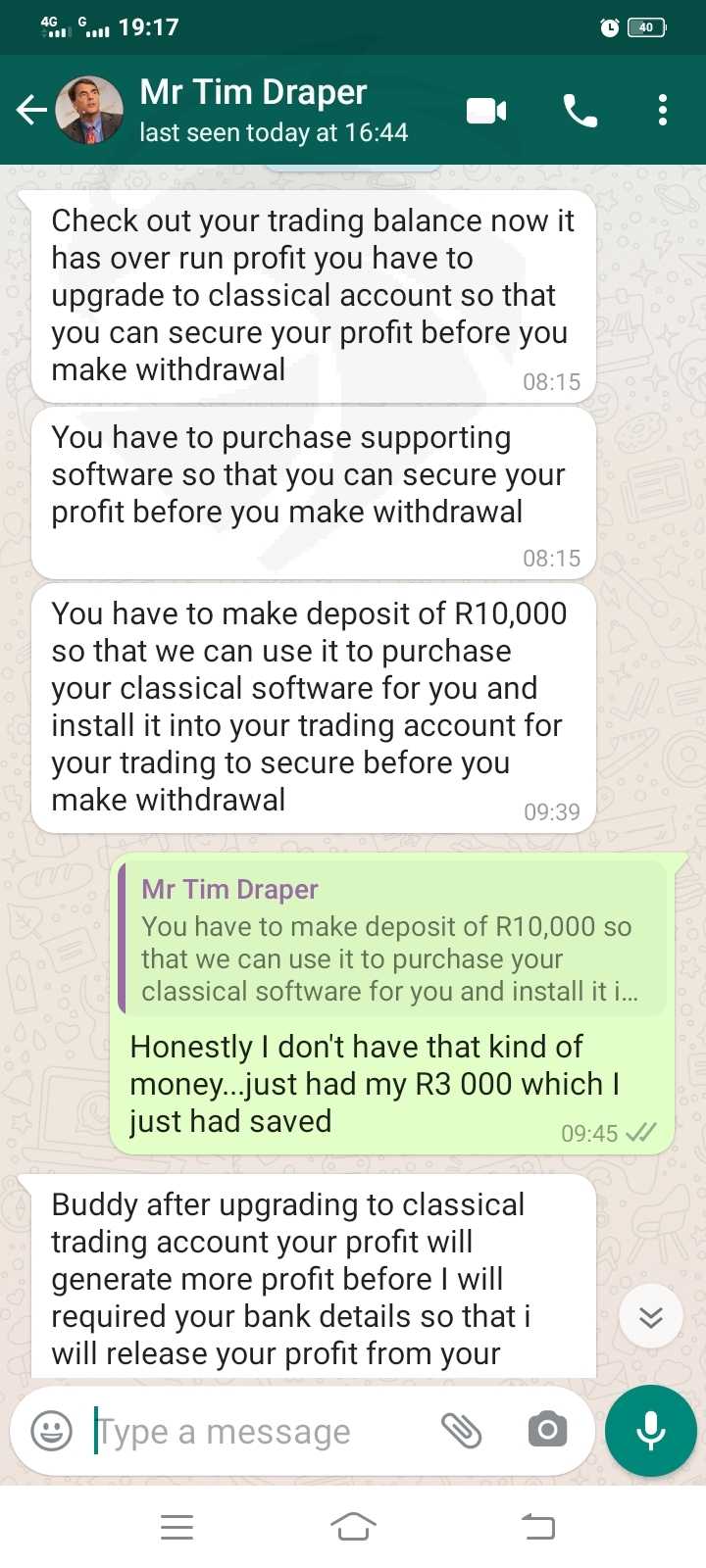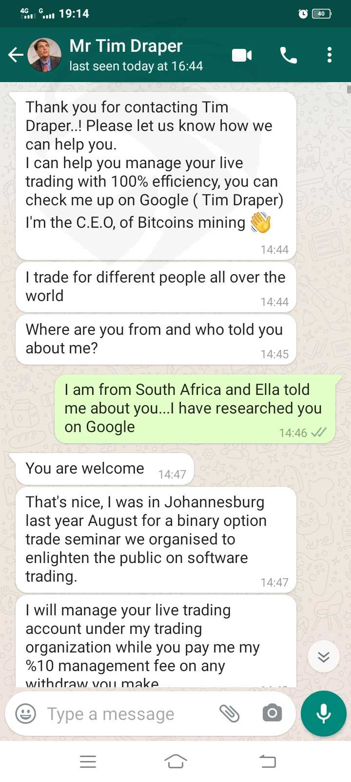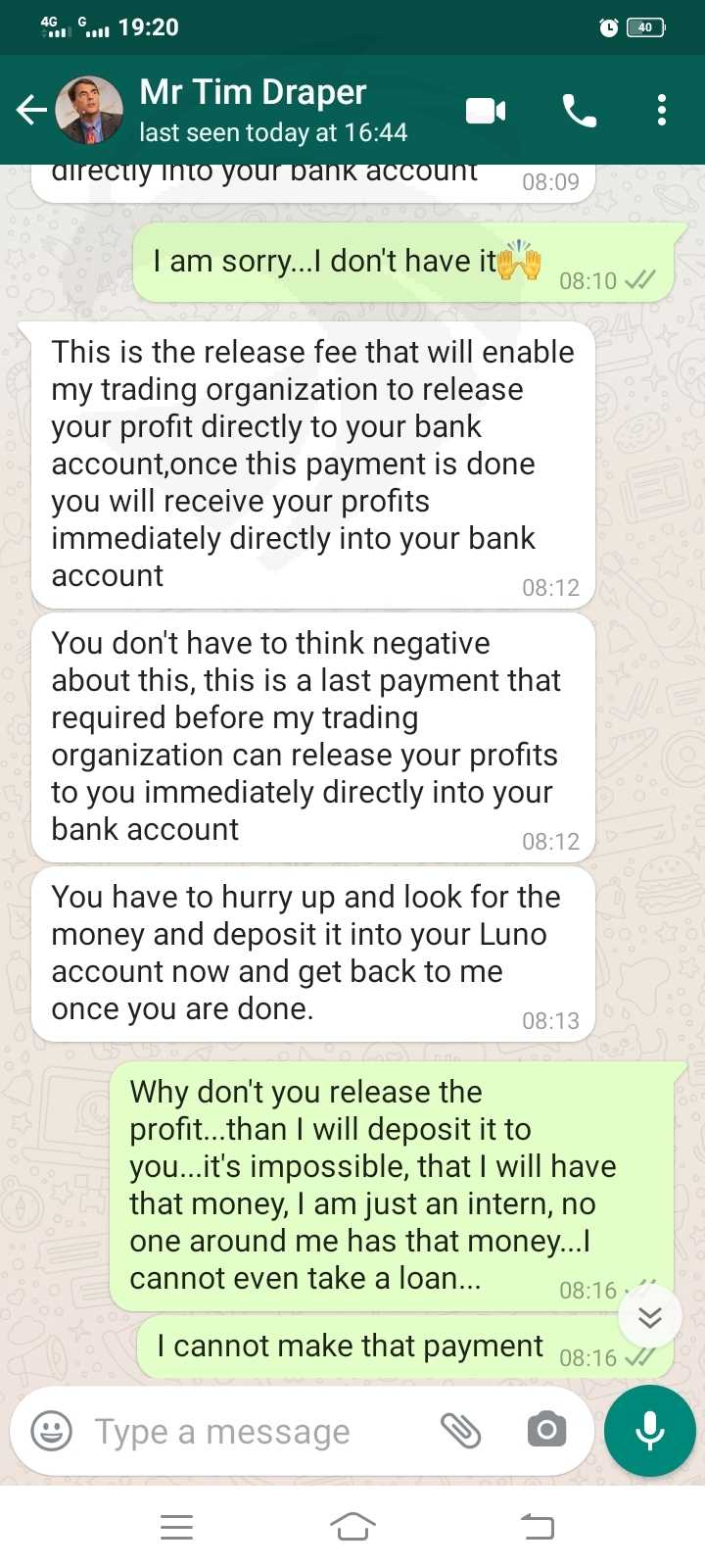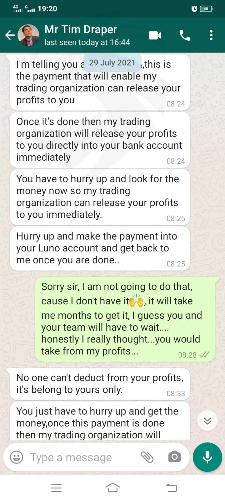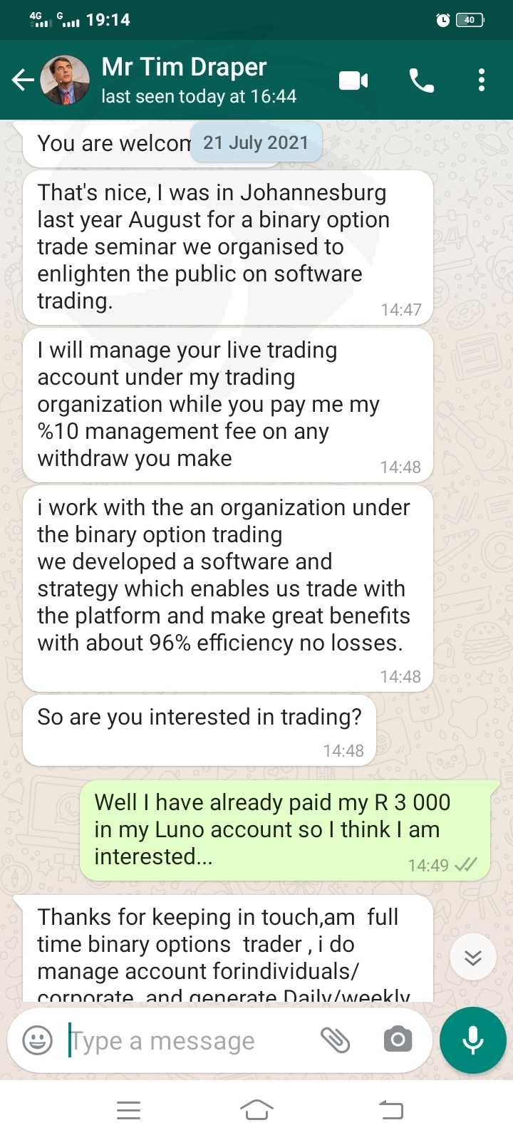 I was invited by a women from Facebook. Named Ella, informed me about binary option trading. She introduced me to a expert trader, named "Tim Draper",the expert trader told me, if I deposit R3000 in my Luno account. I would get a profit of R33000. So I deposited R3000. Then the trader said I must deposit R10000 because my profits over grow. I now require a classical system.Few days later he said my profits can be released. I just need to pay the organisation R30000 for trading for me.