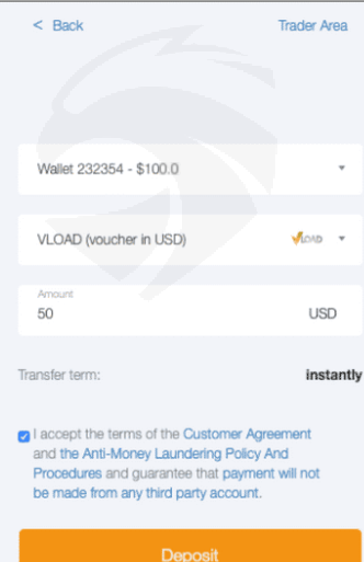I deposited $50 to this brooker though vload no issues! and once I decided i wanted to withdraw my $400 profit vload and tradersway, they are not allow me to do withdrawal .