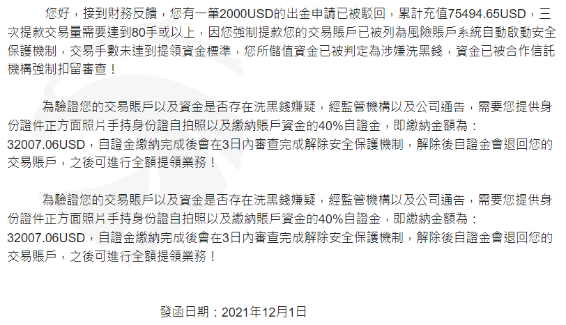 申請出金2000USD卻收到mail客服的mail被駁回,說累計充值75494.65USD,三次提款交易量需要達到80手或以上,才可以出金,但是我需要用到我的資金,卻被硬是說我涉嫌洗黑錢。明明是我的帳戶,卻要被你受控,法律哪一條說我要繳自證金才可以澄清我不是洗錢的。而且繳錢也不是繳給政府機關,而是繳給卷商。這是變相的強迫入金。