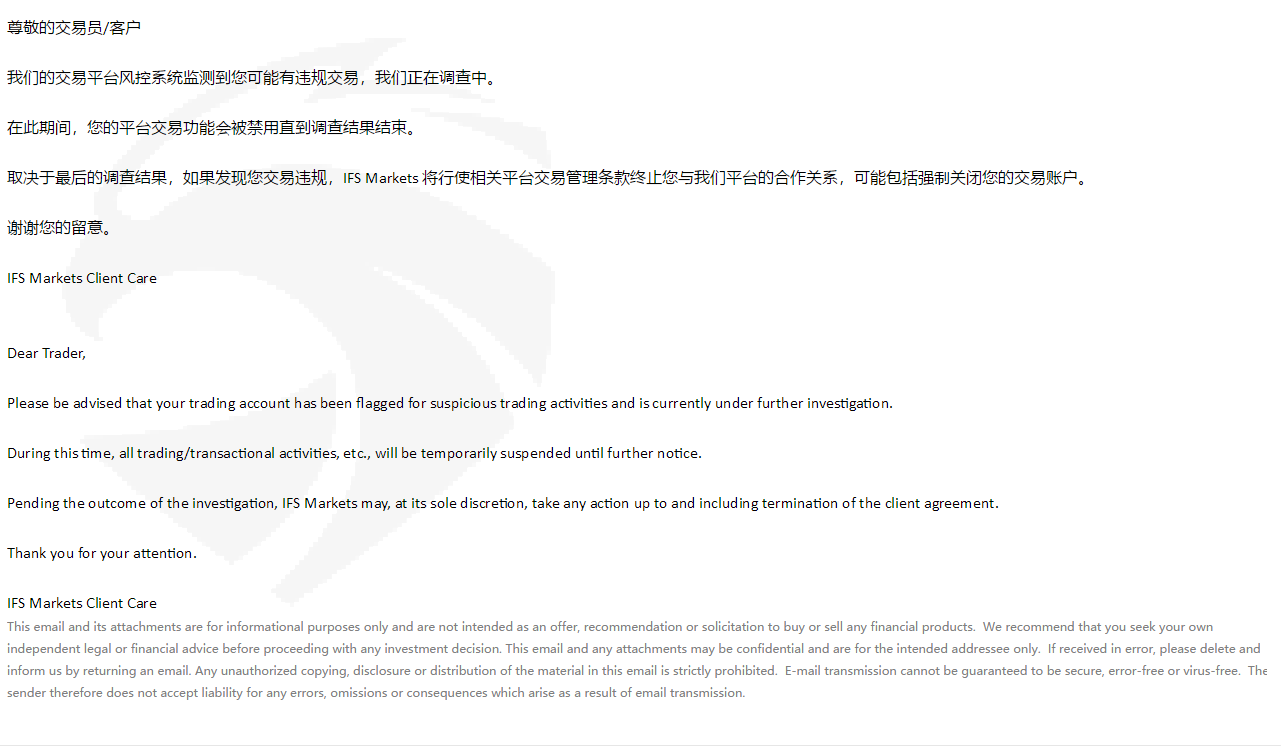 IFS Markets出金一周了 给我发个邮件一场说异常交易 一直没有回复 MT4也交易不了。一直不给出金。MT4号109615