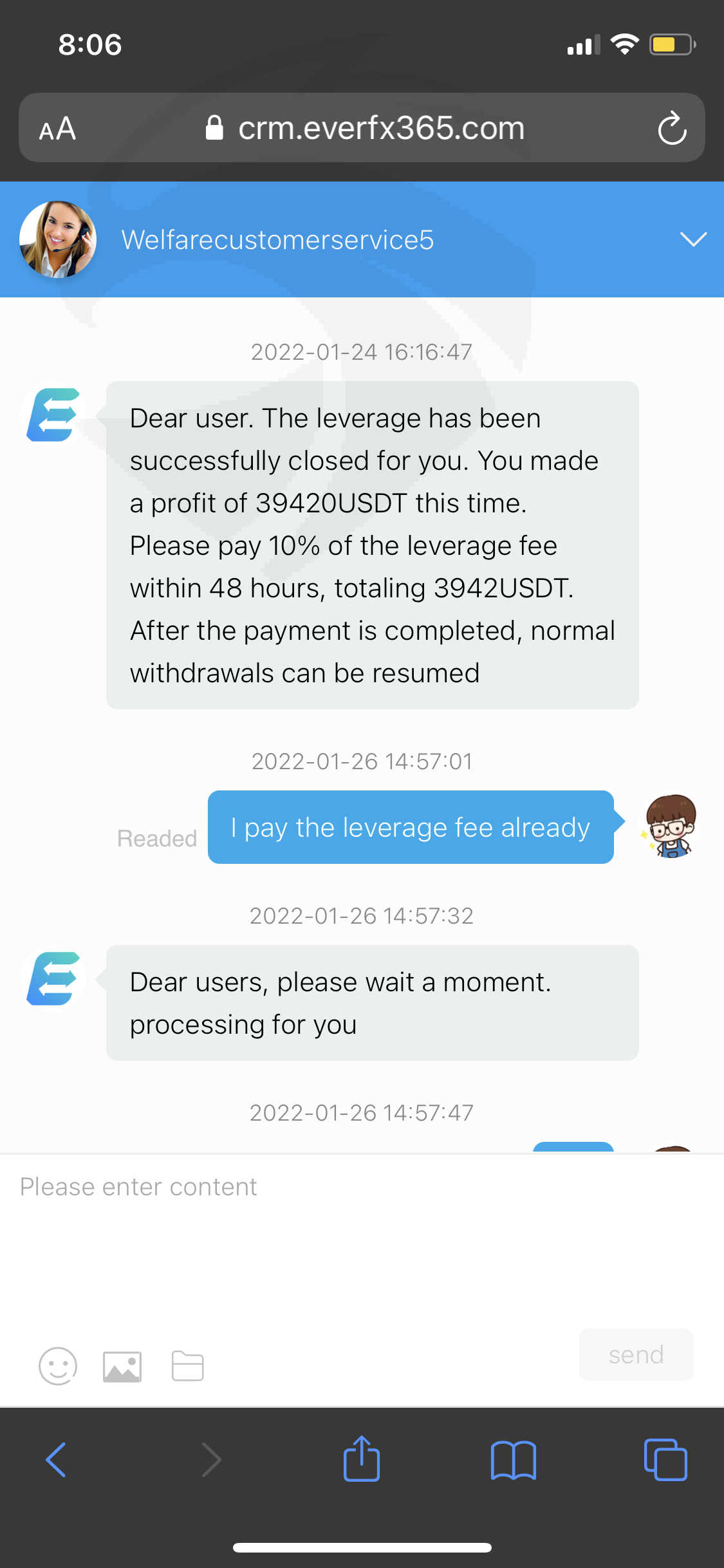 最开始告诉我,我可以操作余额的10%。 我加钱之后告诉我说不能从利润中扣钱,我又付了钱。当我想全额出金的时候又告诉我要付12%的税,我付完之后又告诉我需要付手续费。我要求从余额中扣取他们不同意,必须让我先支付费用,我还不能取消。我要求换银行,我的钱还没到账,也没有回到我的账户里面。总金额是47132.00 USDT