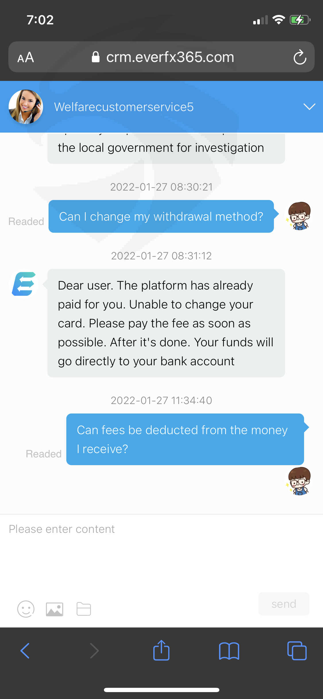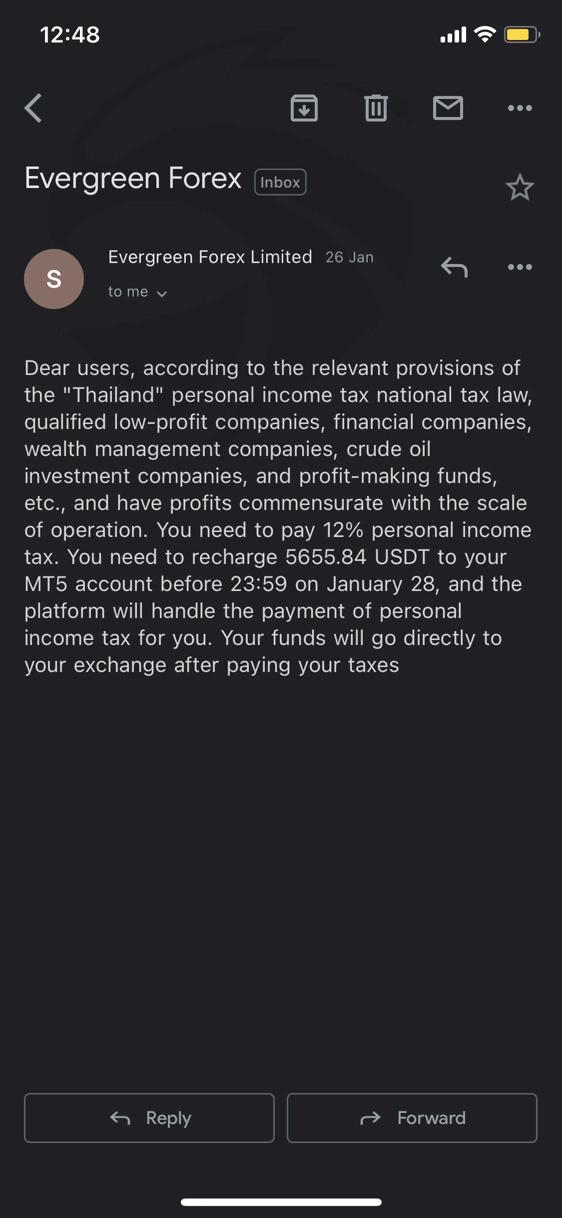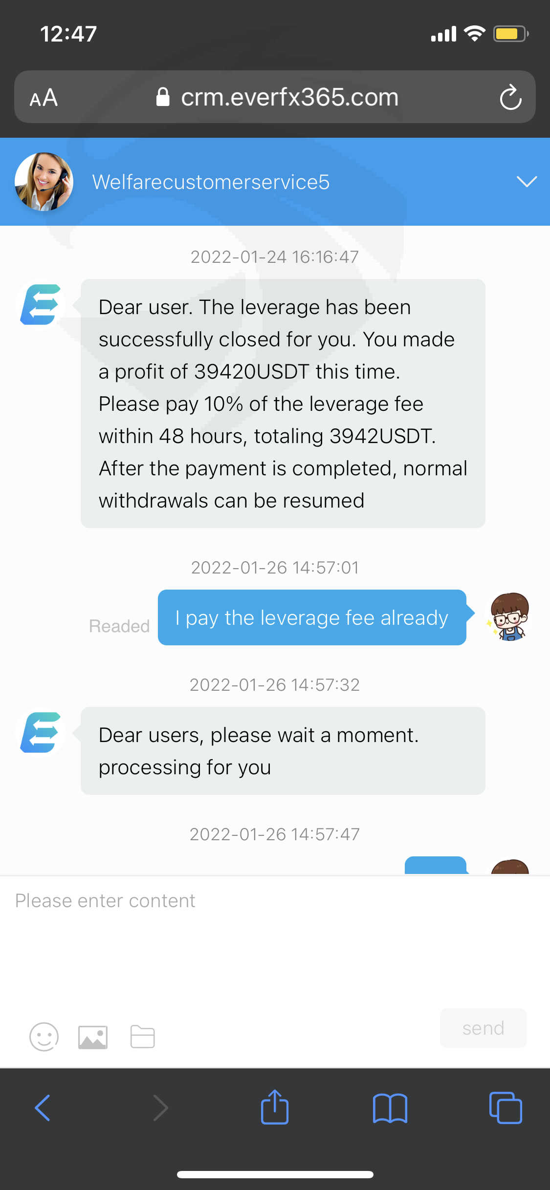 I want to withdraw all my funds which is 47132.00USDT but this time the broker charges a different fee, the first time is the leverage fee of 10%, amount 3942USDT. After that, they said I had to pay 12% personal income tax amount 5655.84USDT. Later they asked me to pay the transfer fee 10% of 4793.85USDT. I told them to deduct from my funds. They said cannot, only need to top up to be able to pay