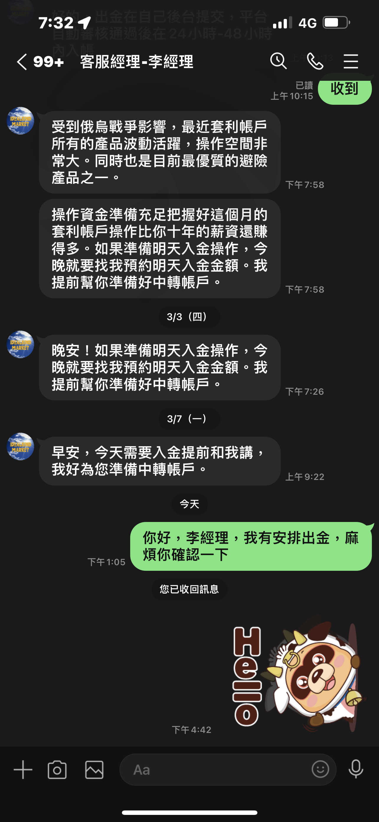 因為從3/7安排出金在3/9有詢問群創機構出金狀況,但都沒有回覆最後在3/11安排其他金額全部出金