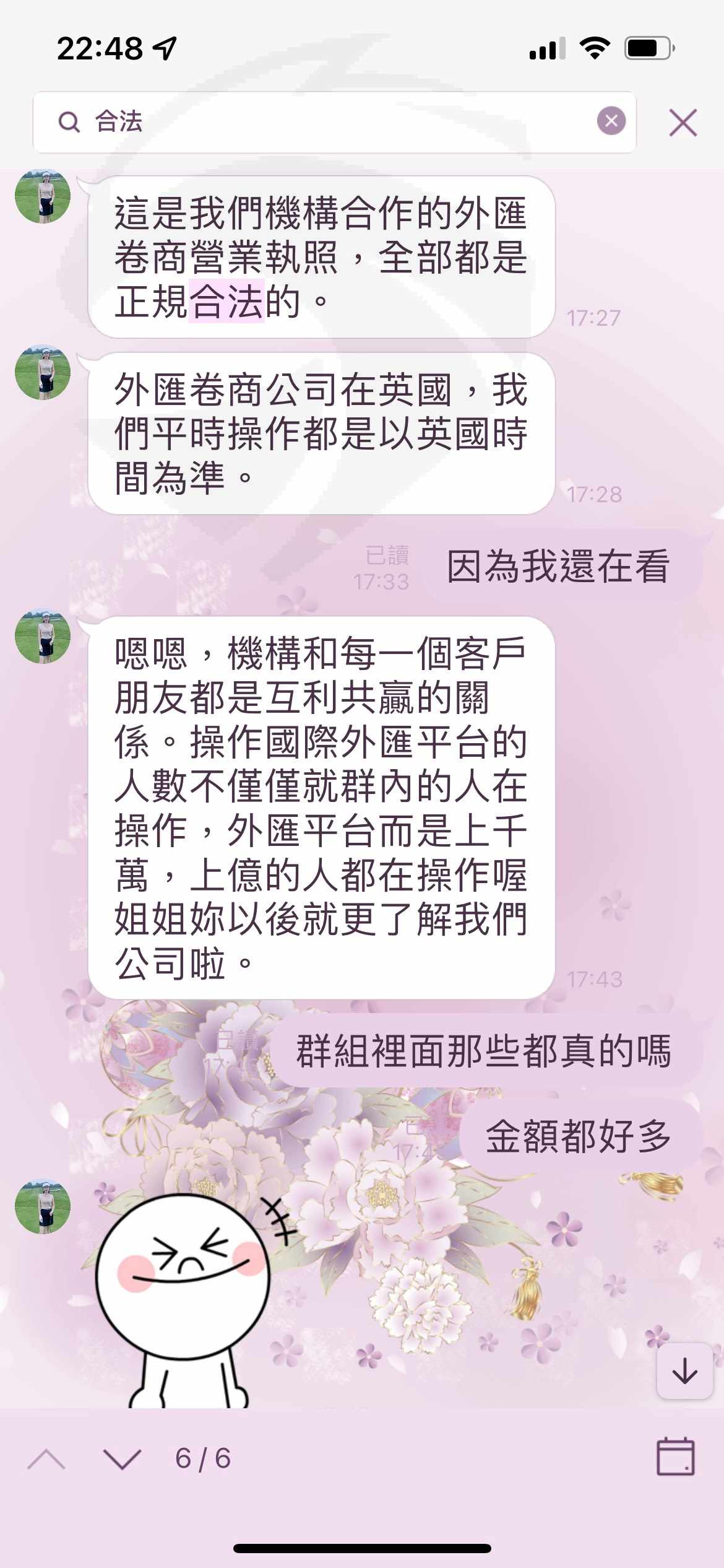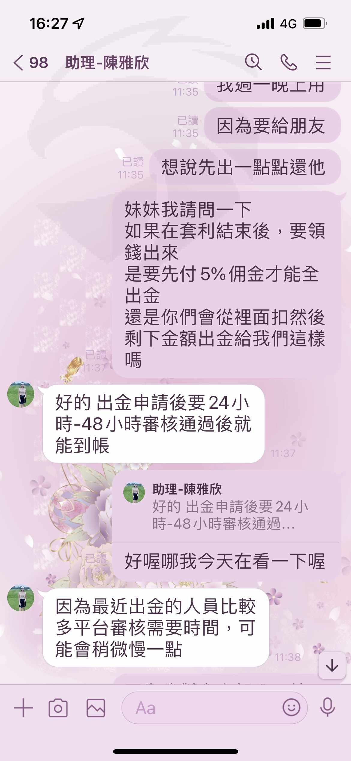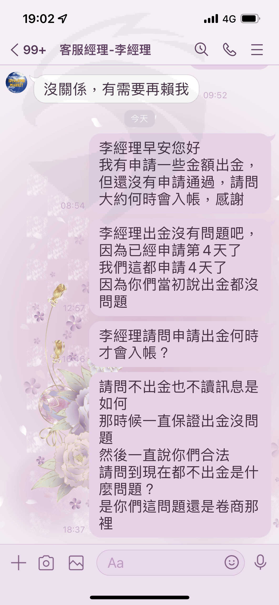 3/7開始安排第一次出金,現在在3/9問自稱是卷商的經理,出金事情,對方都以很多人安排出金為理由,然後在3/9晚上開始傳訊息都不讀不回