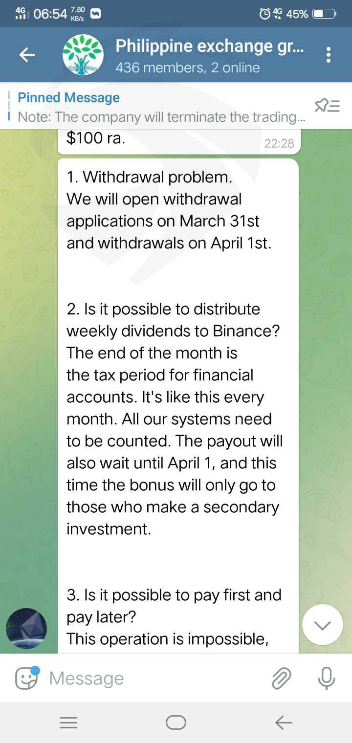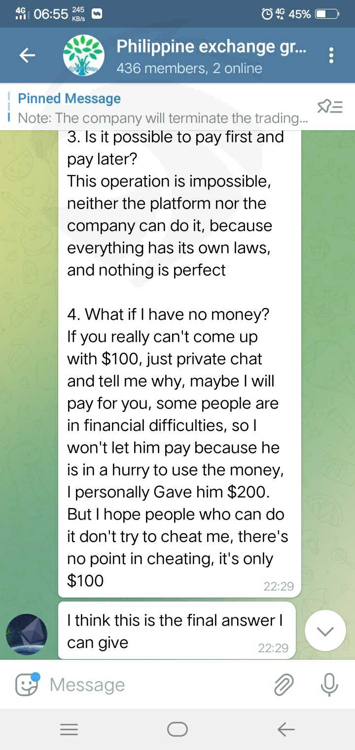 我只是想曝光一下静小姐是个什么样的女孩,我不知道她的真名。但我只知道她在我国有一个男朋友。Lite Shipping Corp.的Capt.Lebiste在宿务市,菲律宾。他们说外汇交易不是骗局。我们信任Jing。因为我们知道有情侣。但是在3月31日退出后突然Jing联系不上,甚至他的男朋友也联系不到他。所以,什么我们做到了?我们认为这是一个骗局,尽管它很痛苦,但我们无事可做,因为这是事实。从现在开始,我想要的只是退款和退款。全部花费 1073.88 美元。我很失望他们对我们做了什么。请女士/先生帮我退还我的钱。帮助我们!这是给妈妈做肝脏手术的钱