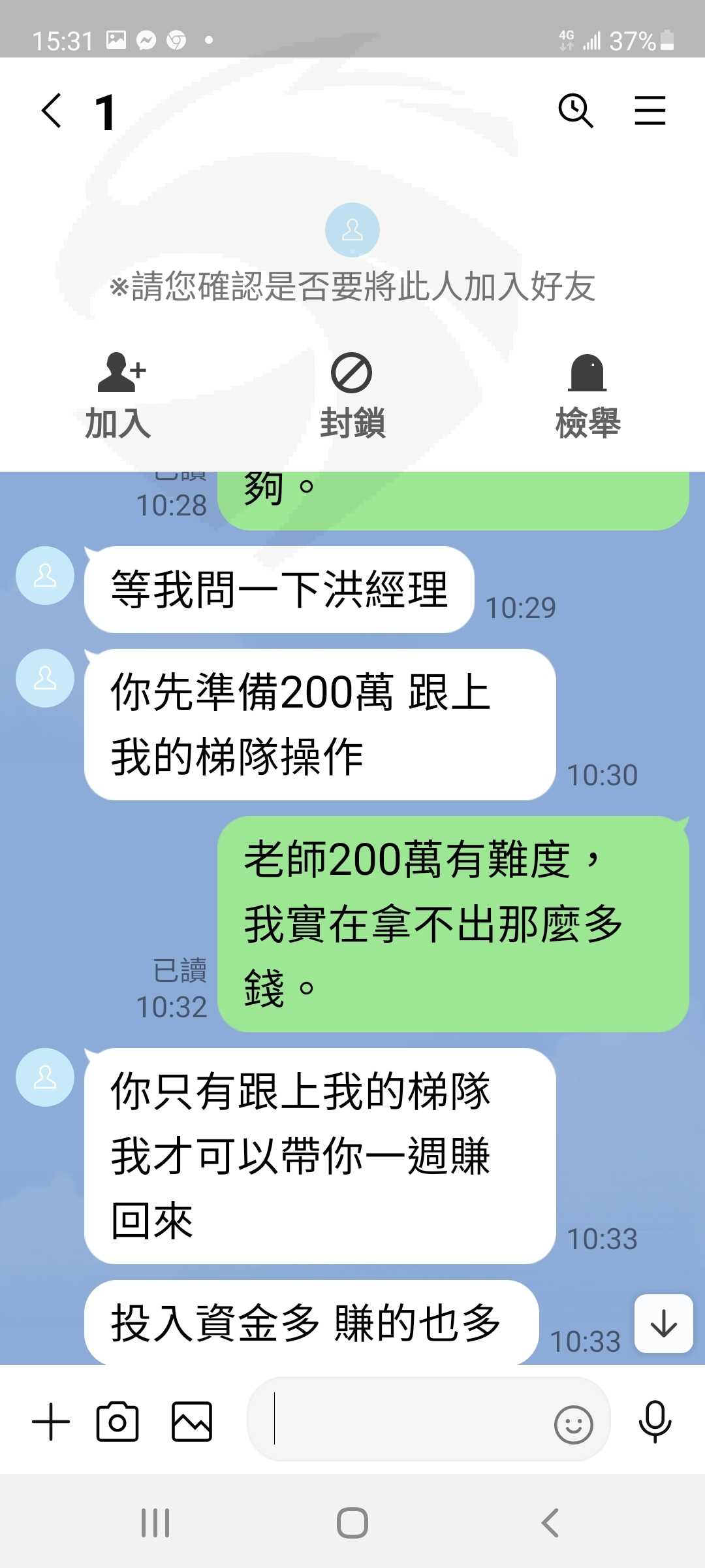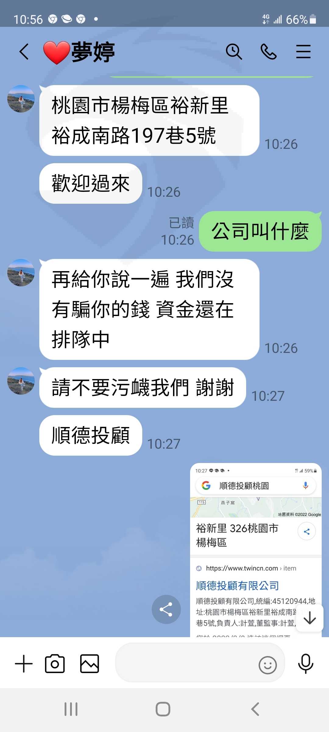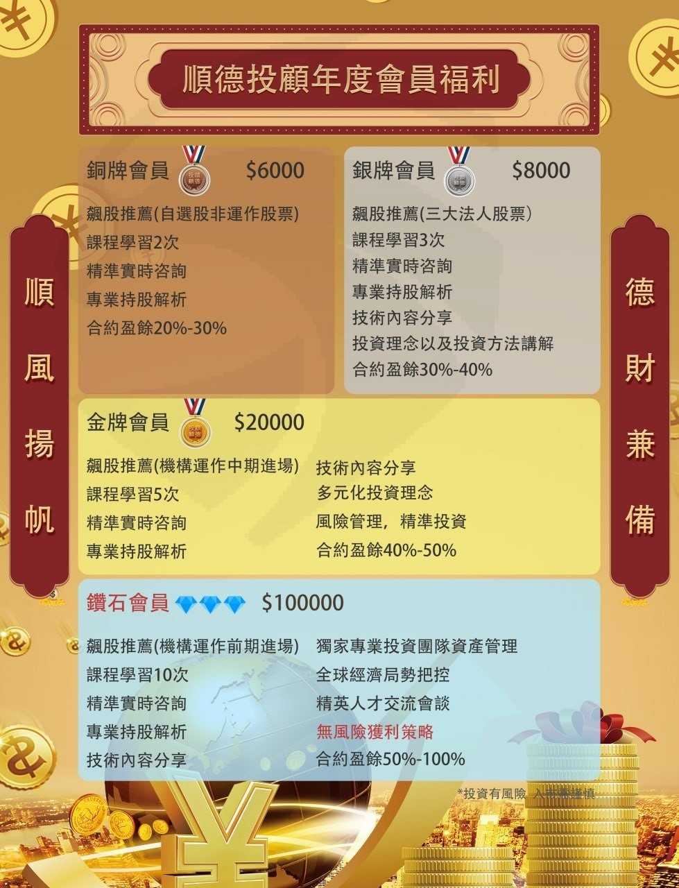 先以順德投顧的名字招募會員,教會員買股票,後來又說他們每年都會操作美指,誘騙入金買美指,使其爆倉,又要求入金,到結束又要收報酬金繳了報酬金又不出金,又要繳加急金。整個群組都是他們詐騙集團的人,要小心不要再有人被騙了。