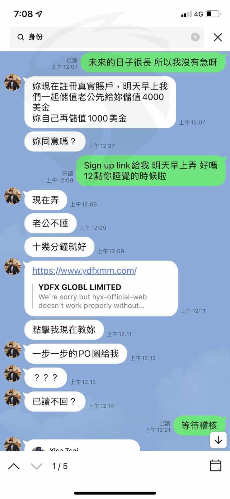 FB真的是詐騙集團的聚集地,好友裡面有一位認識3-4年的男生在他的介紹去YDFX開戶投資,誰知道認識這麼久的人會騙人,對方還給身分證讓人安心,被你們提醒發現一切都是假的,質問對方卻都不承認,最後帳戶裡的錢都領不出來儲值4000美金已經是全部積蓄了希望能取回