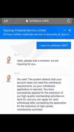 我连续一周每天都打电话给他们,要求退还我的钱,客户经理一直拒绝联系我,所以我平仓了所有的持仓并提出提款请求,他们一直拖延我直到 fintrack / org 取回款项并进一步曝光了Lunboux的恶意行为,他们会不择手段地试图让你输给他们。