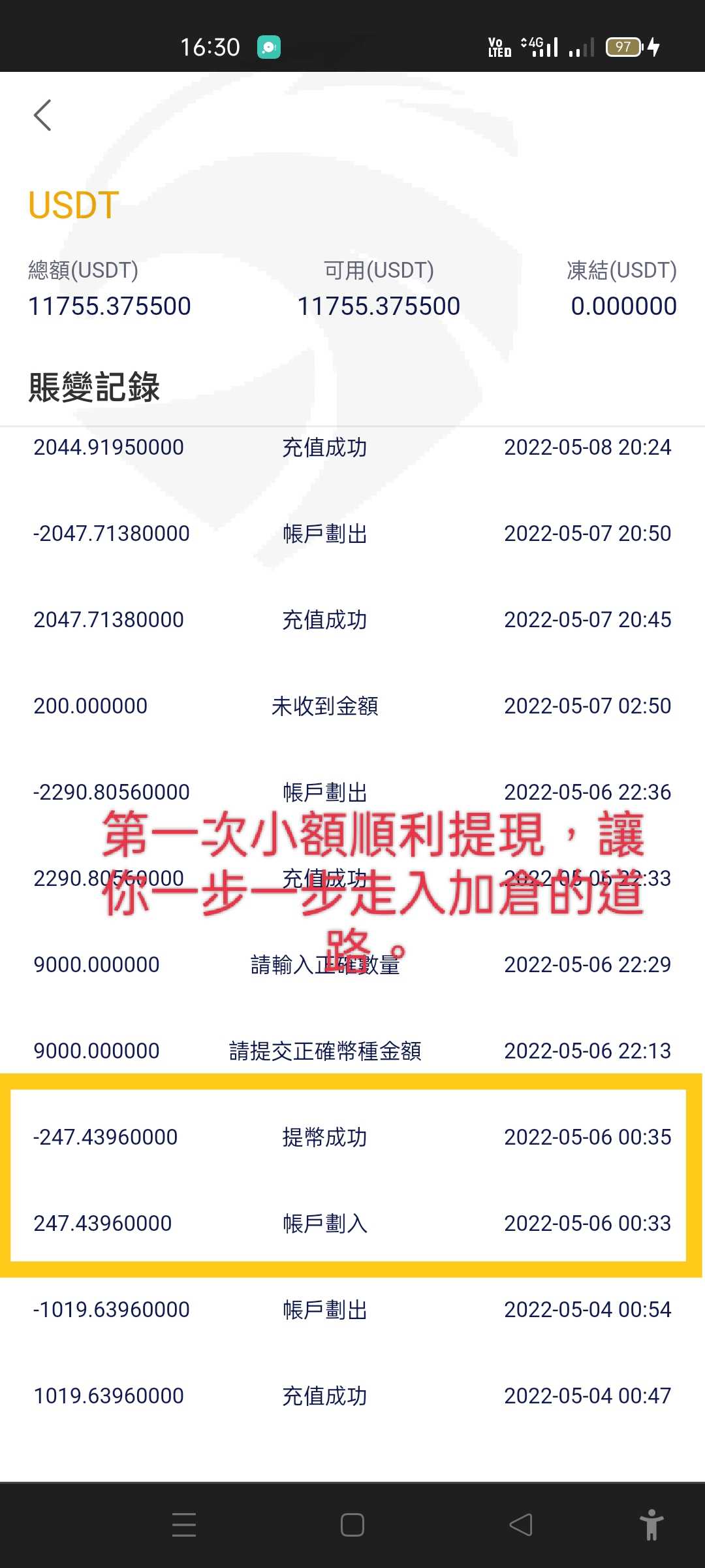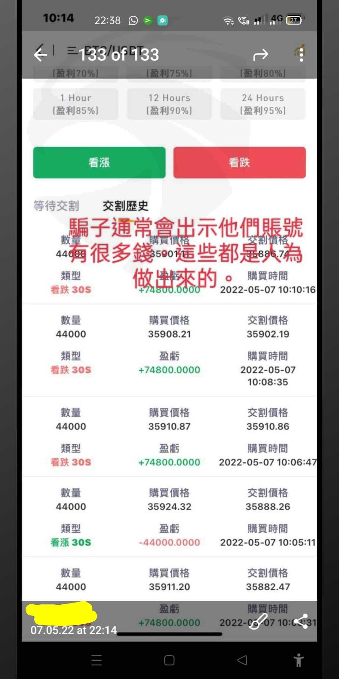 第一次小額提起,放下戒心。第二次24小時審核或區塊鏈堵塞,最後一次,觸動大提款通道,要交40巴仙以你現在的倉位。期間不斷叫你建倉,誘導你倉越大,利潤越大。騙子會出示你和他一起做交易和出入金的記錄,都是由他們操控,記錄都顯示很高額,讓你心動,一心動,接下來你就痛。通常會叫你入金,才肯帶你交易,一天一次,讓你期待,不入就不帶,這就是他們的心理戰術。這些騙子還會鼓勵你,要做就不要畏首畏尾,要堅持,要去創造動力,所謂的動力,就是沒錢,去想辦法借。他們不會理你死活,他們只會榨乾你身上最後一滴血。貪字就是貧,這次我狠狠的讓我體驗到,也是血的教訓。希望大家遠離這些小和黑心平台。寧吃開心粥,也不要吃愁眉飯。我慶幸沒有去借地下錢莊或信用卡,不然真的是翻不了身。