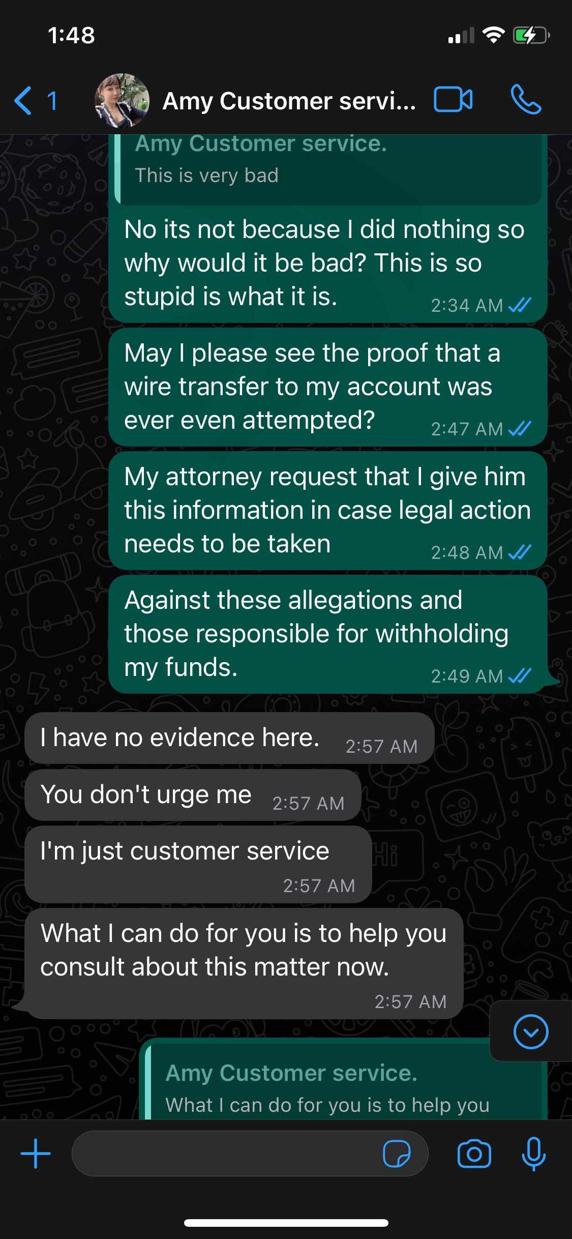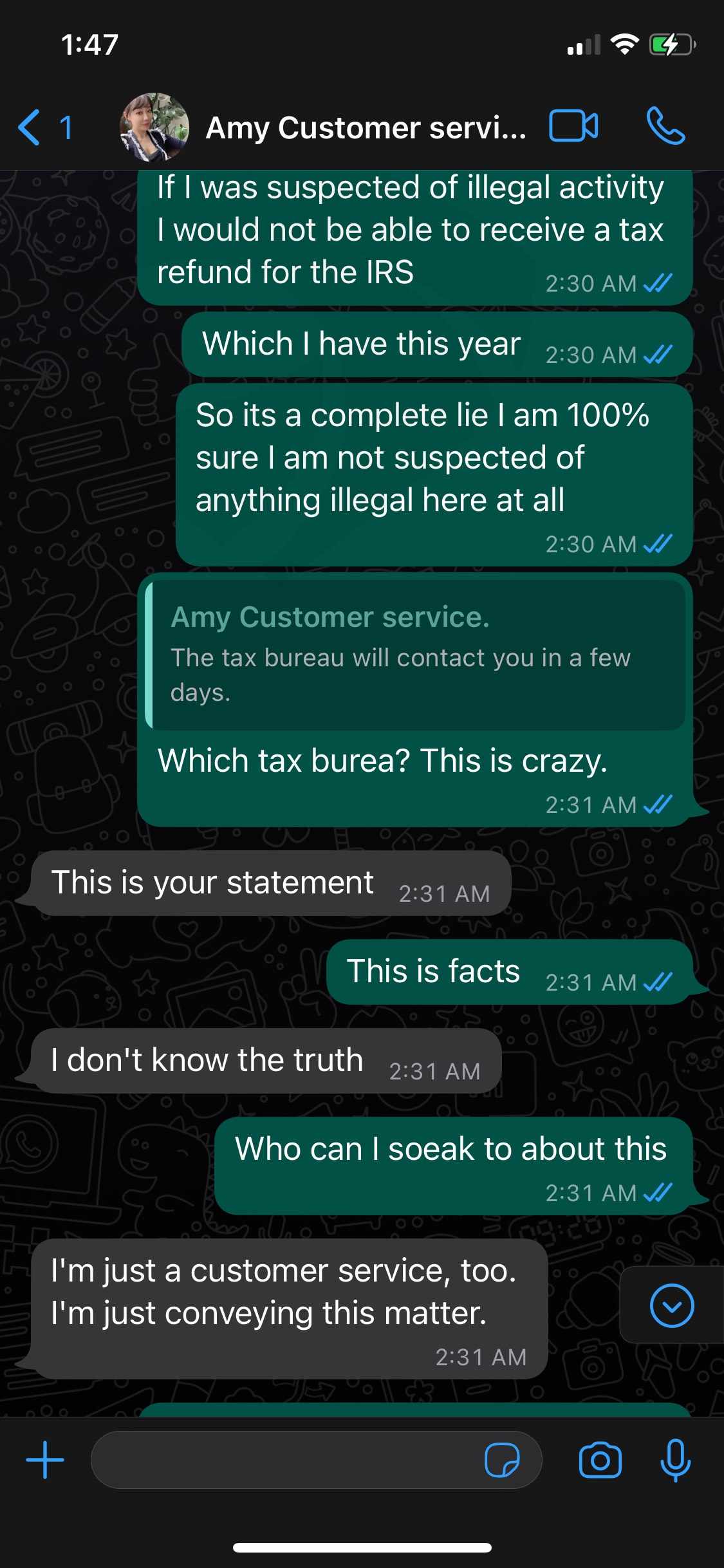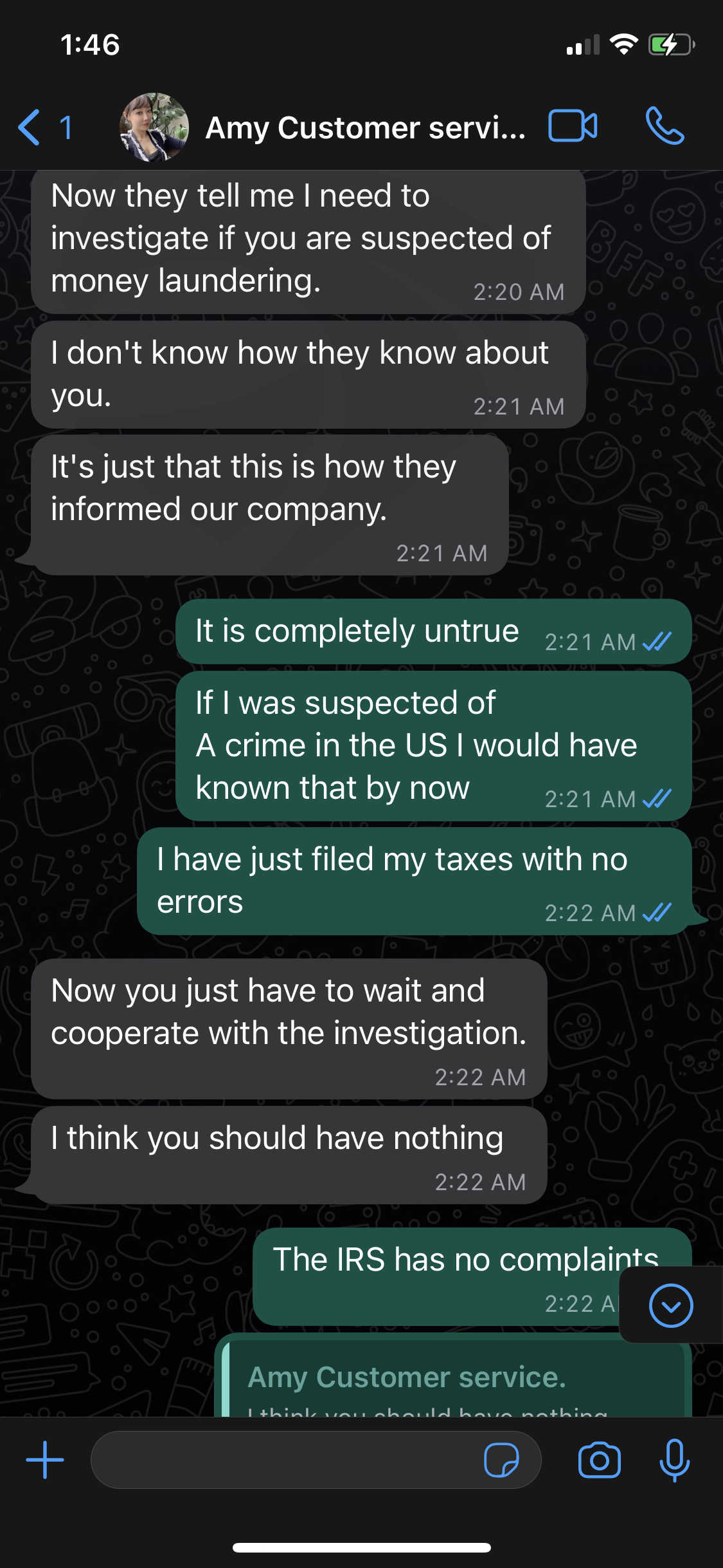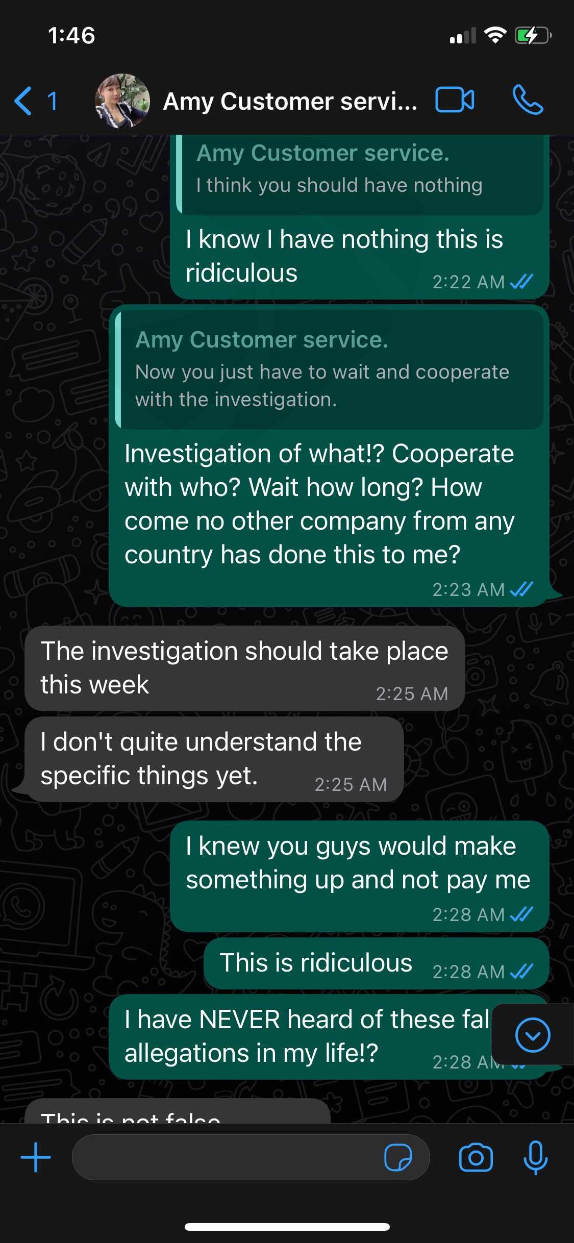 我想提供与SAEN市场客户服务代理的聊天记录 。我在5月21日星期六被告知,我账户中的总金额的电汇将被发送到我的银行账户。几天后,我被告知电汇被截获,必须首先对我的财务状况进行调查,我被指控从事非法活动。我在下面提交的证据表明,客户服务代理声称延迟发放我的资金的这些虚假指控背后缺乏明确的解释和证据。我没有得到任何时间框架,也不知道这个所谓的调查将进行多长时间以及我什么时候能拿到钱。另外,客服已经开始完全不理我了,我找不到其他人可以联系我的情况。