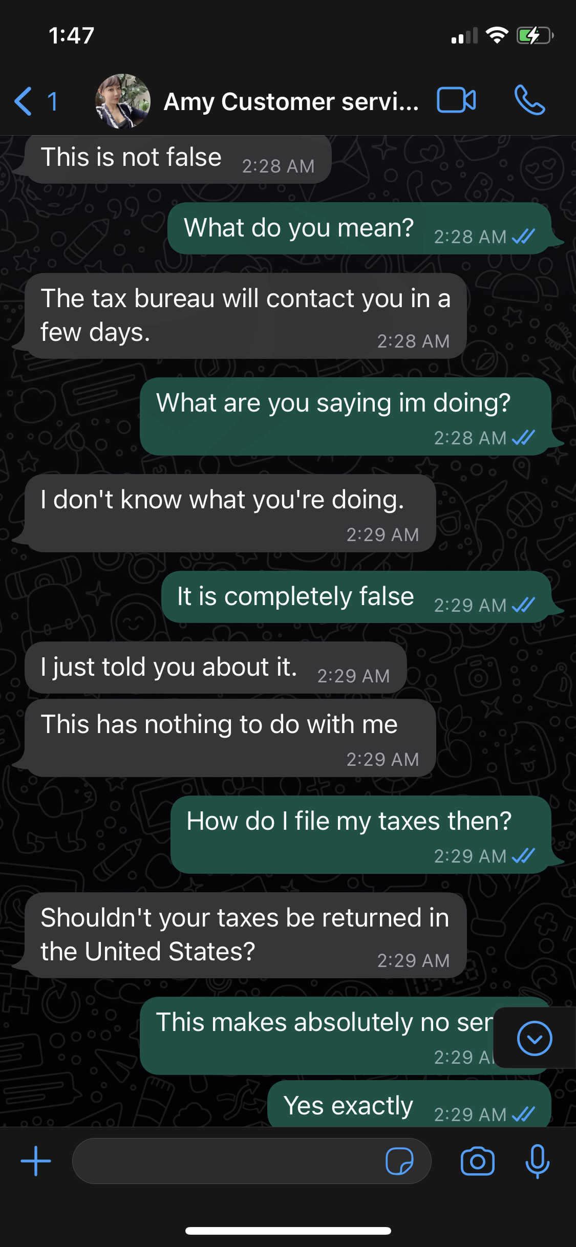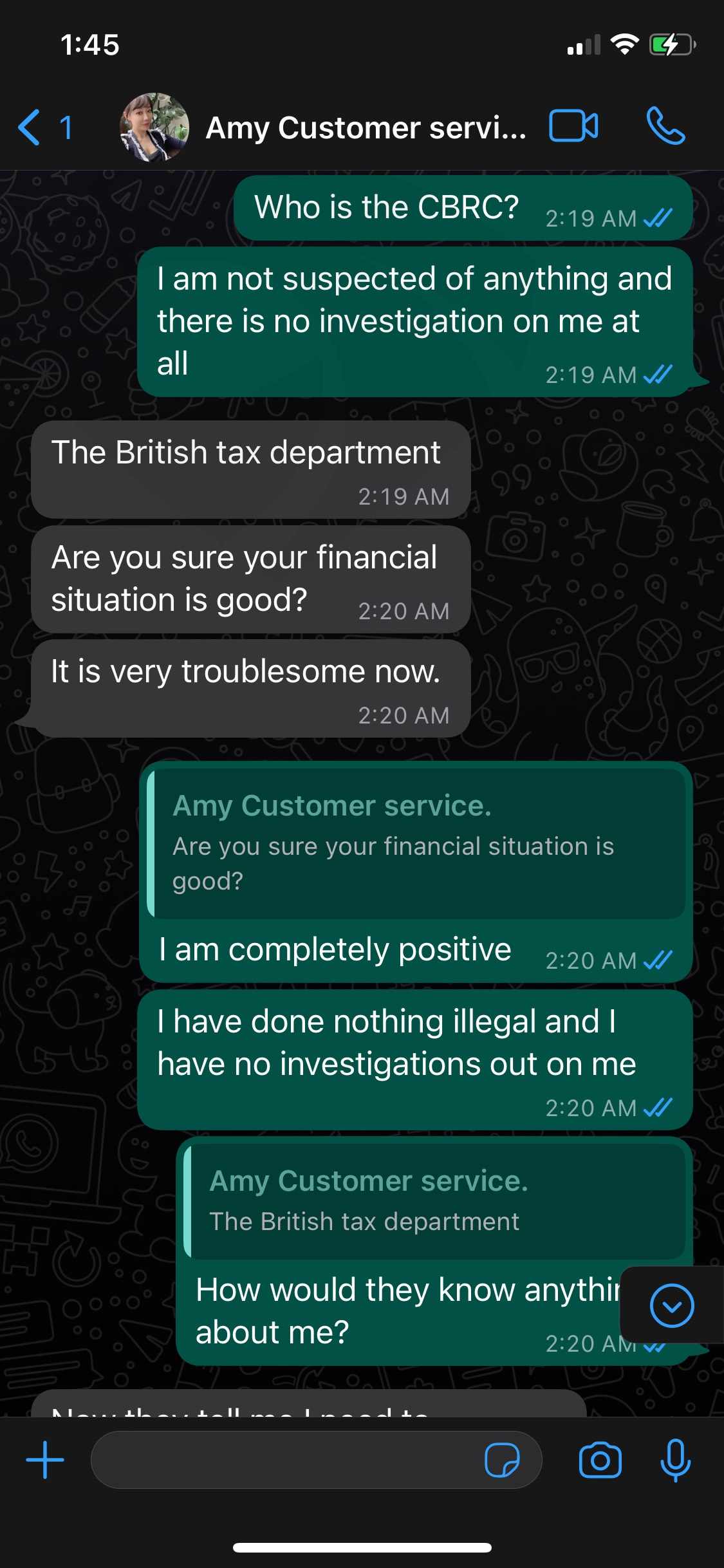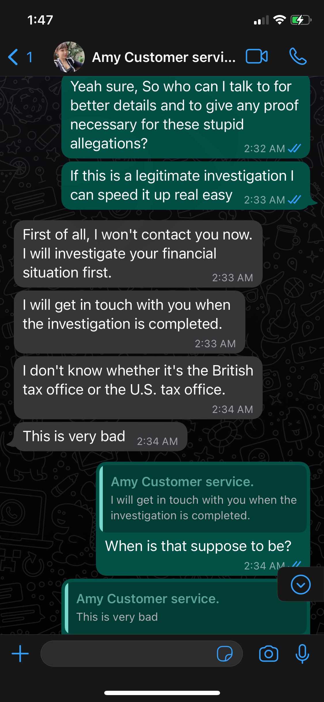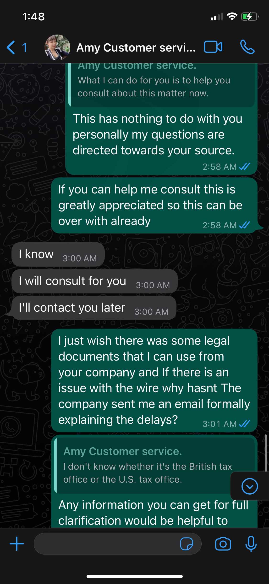 我想提供与SAEN市场客户服务代理的聊天记录 。我在5月21日星期六被告知,我账户中的总金额的电汇将被发送到我的银行账户。几天后,我被告知电汇被截获,必须首先对我的财务状况进行调查,我被指控从事非法活动。我在下面提交的证据表明,客户服务代理声称延迟发放我的资金的这些虚假指控背后缺乏明确的解释和证据。我没有得到任何时间框架,也不知道这个所谓的调查将进行多长时间以及我什么时候能拿到钱。另外,客服已经开始完全不理我了,我找不到其他人可以联系我的情况。