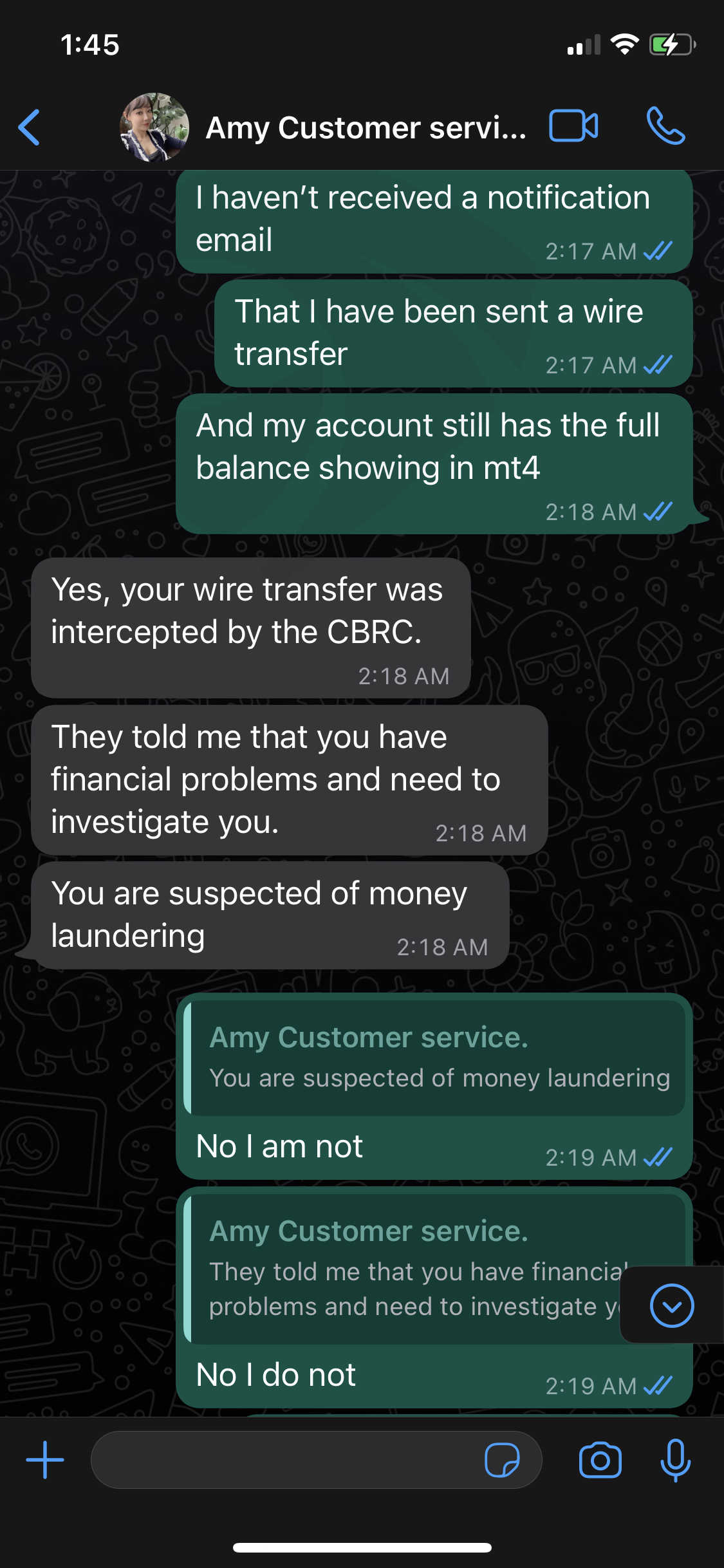 I want to present chat records with a customer service agent from SAEN Markets. I was told on Saturday May 21st that a wire for the total amount in my account would be sent to my bank account. A few days later I was told that the wire was intercepted and that an investigation of my financial situation has to take place first and I was accussed of Illegal activity. The evidence I submit below is to show the lack of clear explanations and evidence behind these false allegations that the customer service agent claims is delaying the release of my funds. I have been given no time frame and how long this supposed investigation will take place and when I will get my money. Additionally, the customer service agent has began to completely ignore me and there is no one else I can find to contact about my situation.