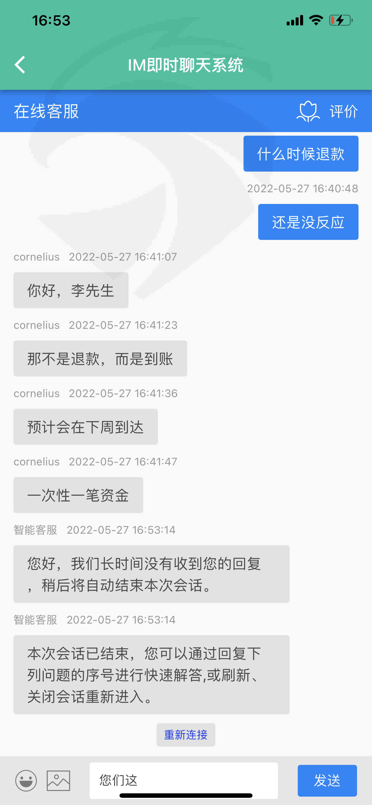沟通一个月,还是找各种理由,开始是什么审核,跟着账号就被封了,拉黑,都无法登入,最后说退还本金,结果是本金也不退,各种理由,只有你想不到的理由……天天说这个做了马上到账,要么就是下周到账,直接上截图吧,这个平台入金了就一分也别想提出来……目前平台还在苹果商城运行