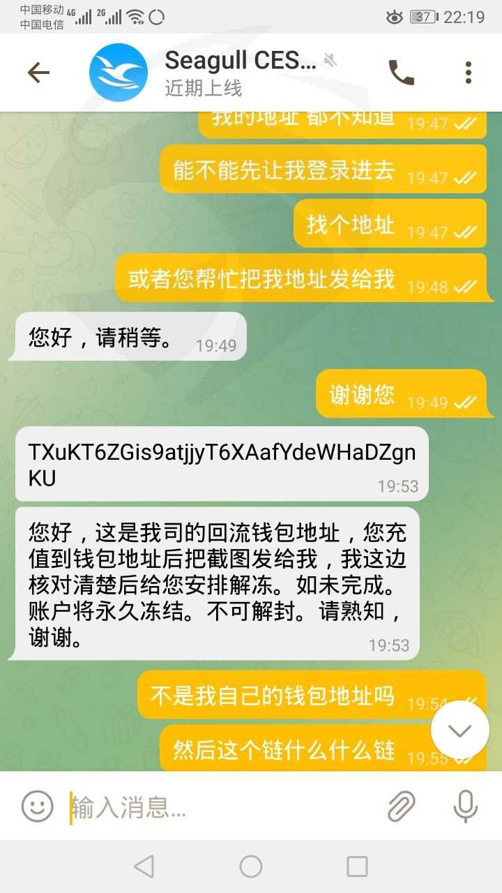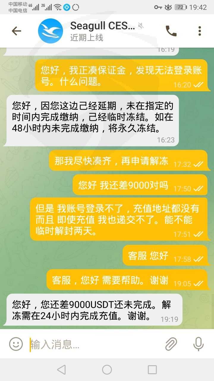 在4月9日至5月1号期间,本人不间断进行存入USDT并合约操作。5月1日,北京时间晚上10点多成功提取了5000USDT后,5月2日再申请提取5000美金,即无法提取,显示账户异常。经询问在线客服后,在线客服给了一个电报客服的联系方式 SEAGULL CES 064进行交流。电报客服说是本人涉嫌洗钱,非法套取平台资金等一系列子虚乌有的理由,同时要求我需存入盈利20%的风险金到个人账号,经风控部门核实后,才可以提币。(详细内容可参客服与我直接的聊天截屏)此时,我才明白过来,SEAGULL交易所就是一个专门骗人的交易所,小额盈利可以提取,大额全部限制。和客服沟通,无力承受存入20%盈利的风险金,自愿放弃全部收益,仅述求取回本金,但均被拒绝。后本人又筹借了2万多的U存到客户指定的地址,然后客户说3天后可以提取,过了3天后,尝试提取失败,客户又说需要缴纳20%盈利税大概15000U才可以,否则48小时后冻结账户,而后在没有存入相应的金额后,账户被限制登录,永久冻结,电报客服也被删。希望各位以我为戒,切不可相信他人带你赚取的诱导,不可在电报群相信任何陌生人,远离SEAGULL交易所。本人总共损失了10.7万U.