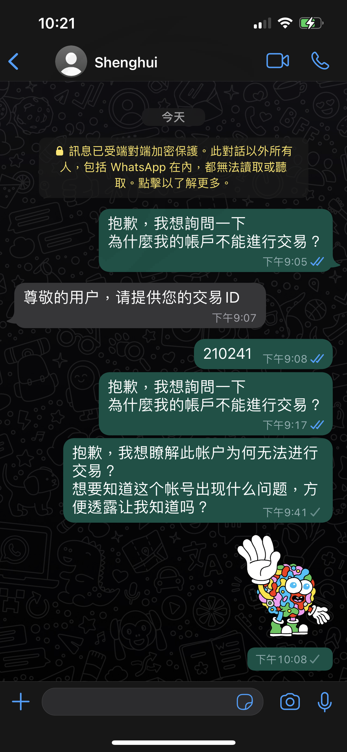 第三次詢問審查結果時,客服人員就都不讀不回。→我透過軟體發現我被客服封鎖?!同時我也發現我無法進行交易,現在這個狀況等於無解了。不知道我這個帳戶出了什麼問題?