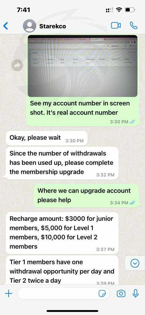 I have been scammed by Starekco where now i am not able to withdraw my earnings. Total balnce in my account is 2255.16 and one lady also helped me in all this trading and she even lent me $80000(screenshot of all deposits) attached. Now customer case is asking me to depsoit $1561 since i was unable to withdraw 5500$$2255.