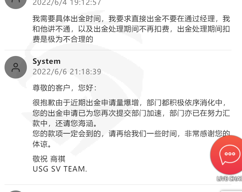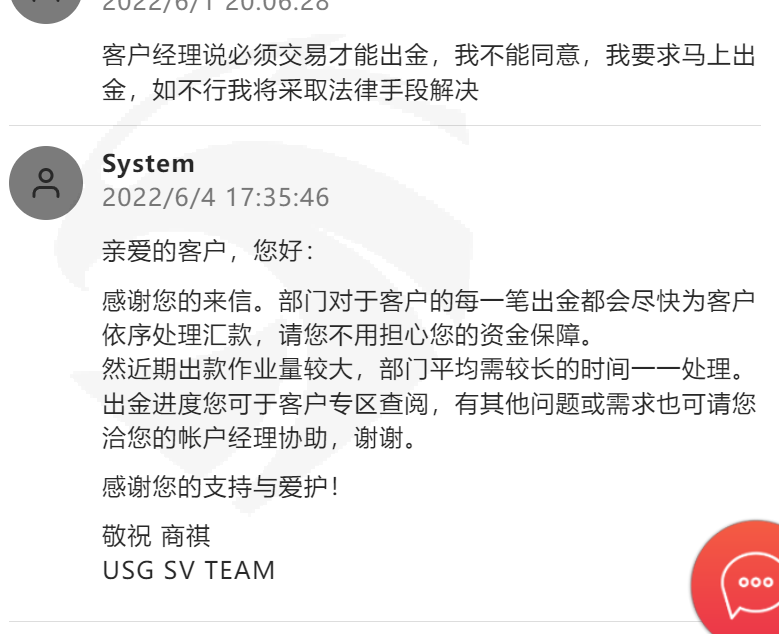 子账户200209957一年多了申请了好几次都没有出金,上次重新申请后又过了15天依然没有出金,照会发了好几封,一直打官腔,客户经理要求必须交易再100手才给出金,我不同意,都赔了,剩个底子,再也不会交易了!不但不出金反而以不交易收取滞纳金为由扣了5美金,这还有天理吗?